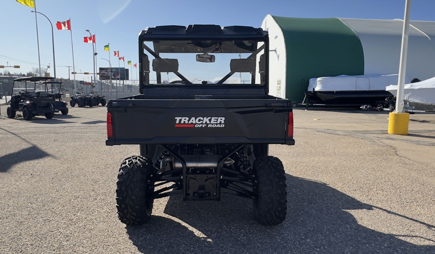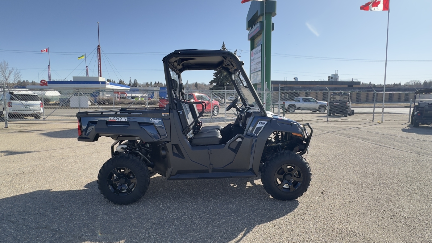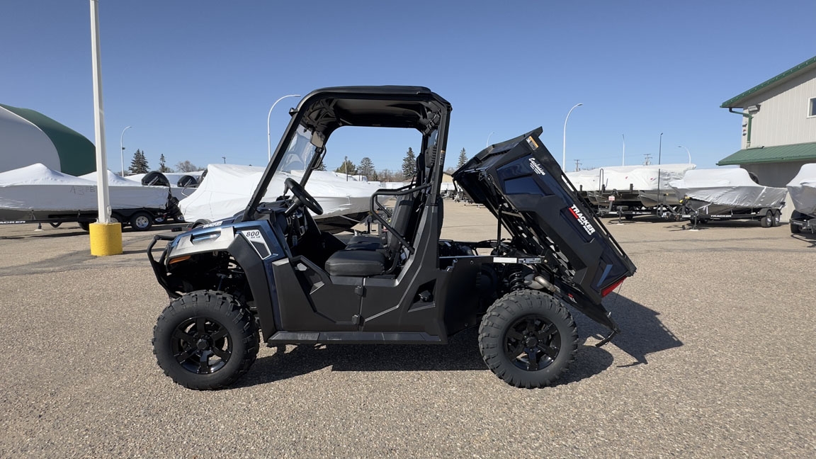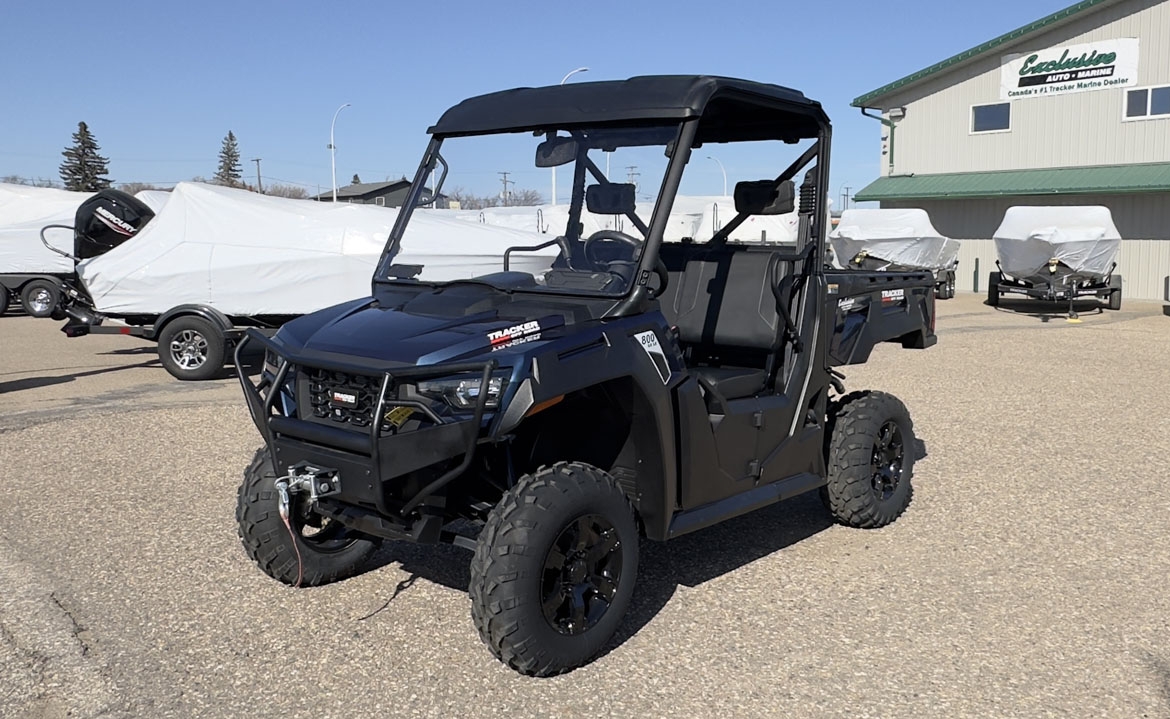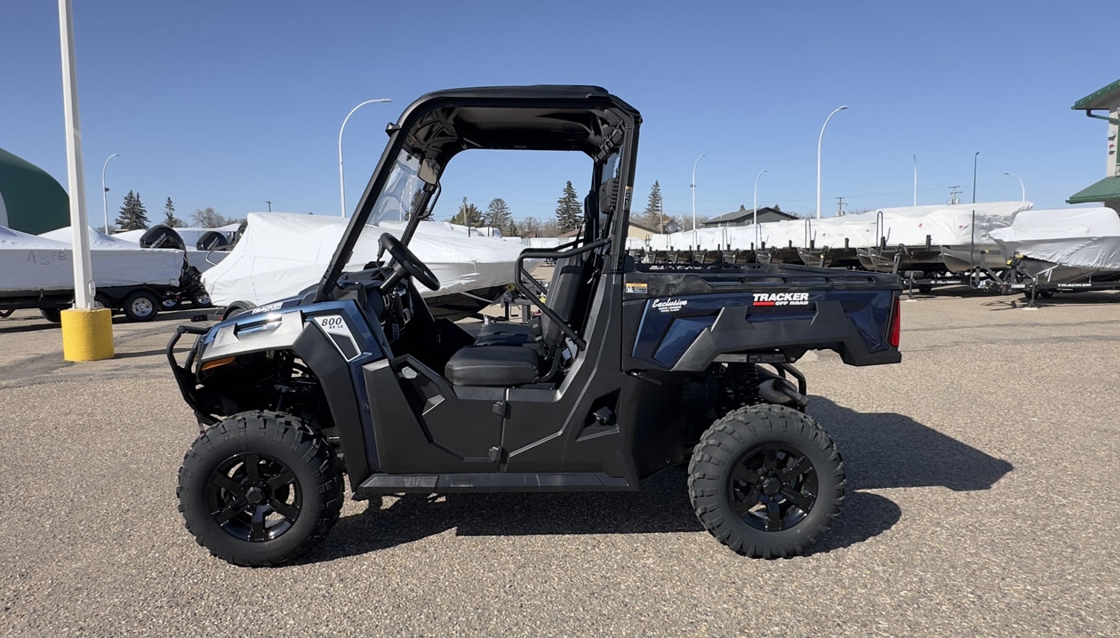 The TRACKER 800SX LE takes the acclaimed capabilities of the base model 800SX—the 50HP engine, 2,000-lb. towing capacity, 1,000-lb. capacity cargo box—and adds new automotive metallic paint (or optional camo), a 4500 lb. winch, ranch bumper and 27" tires. Further updates for 2022 bring improved acceleration, enhanced throttle response, and an all-new suspension that improves ride quality and offers up to 13" of ground clearance.