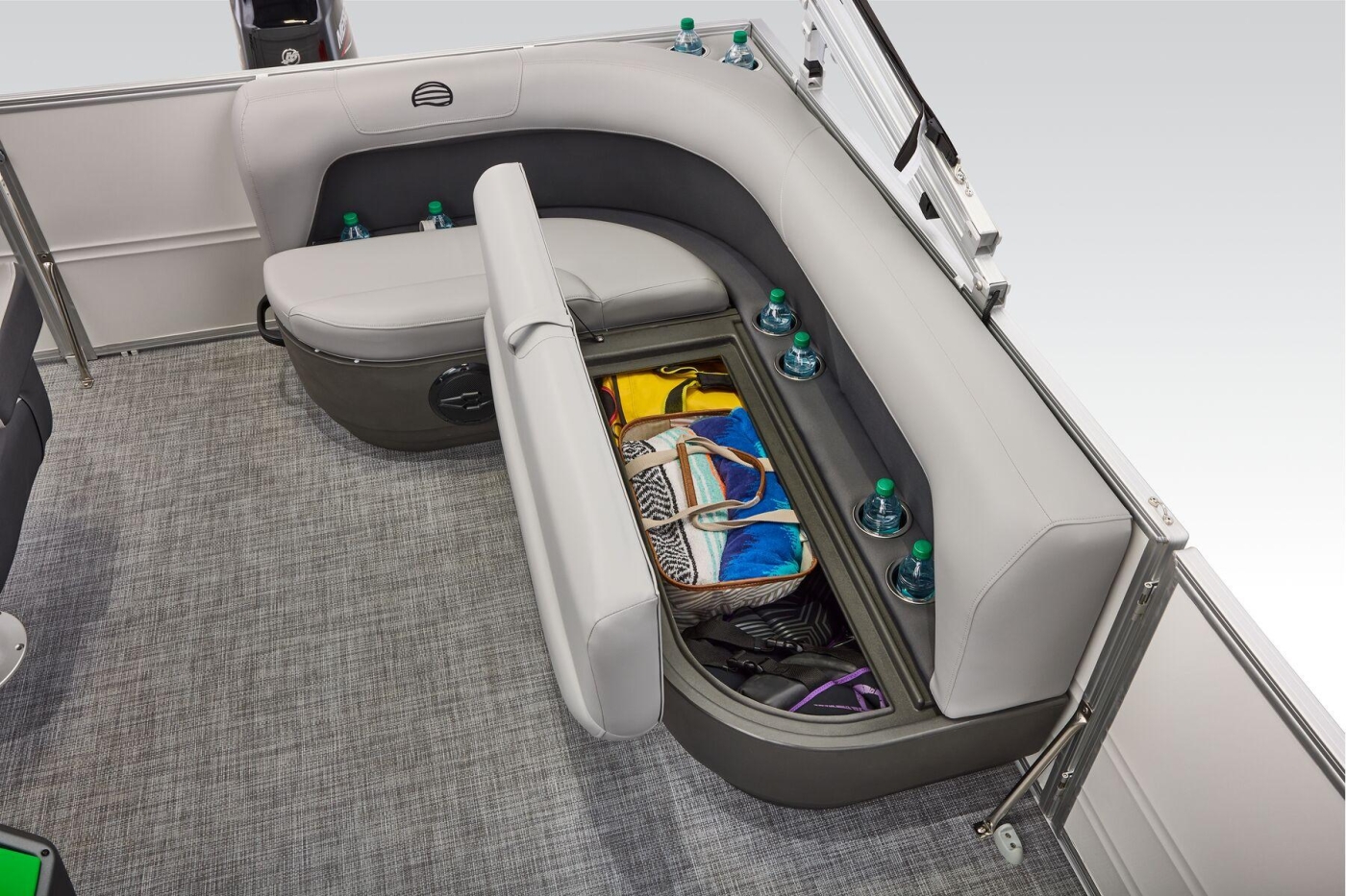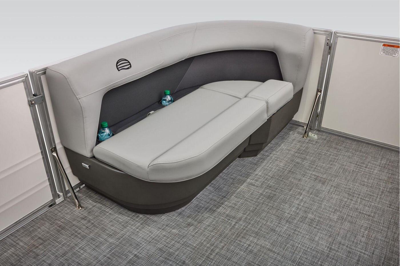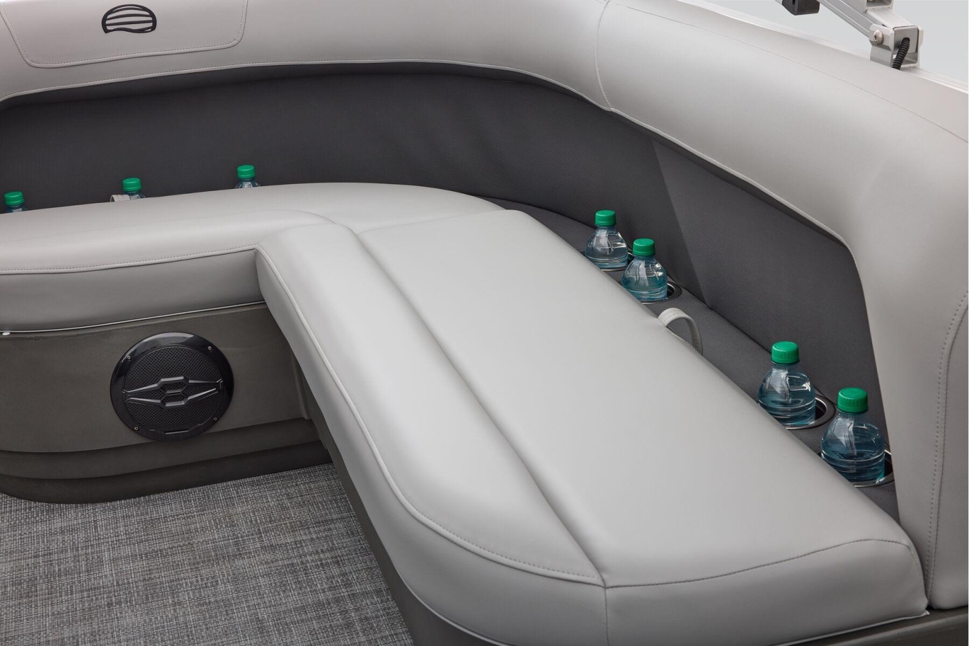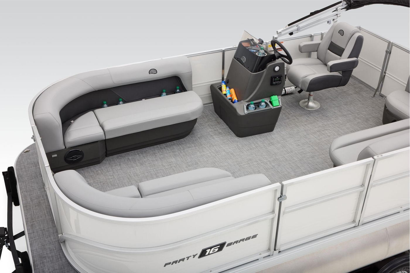 This year's PARTY BARGE gets some slick upgrades. Extra cupholders and storage built into the lounge backrests and improved handles make keeping your supplies at hand easier than ever. A new driver console design creates extra style. The boarding ladder has wider, more ergonomic steps. Crank up the soundtrack of the summer with the standard Bluetooth®-capable Wet Sounds™ stereo and pull up the 7' bimini top to party in the shade when the sun is high. Find your corner of the lake and relax in one of the three corner lounges.