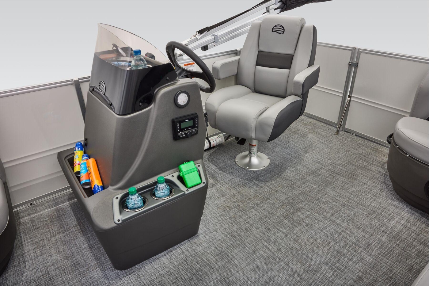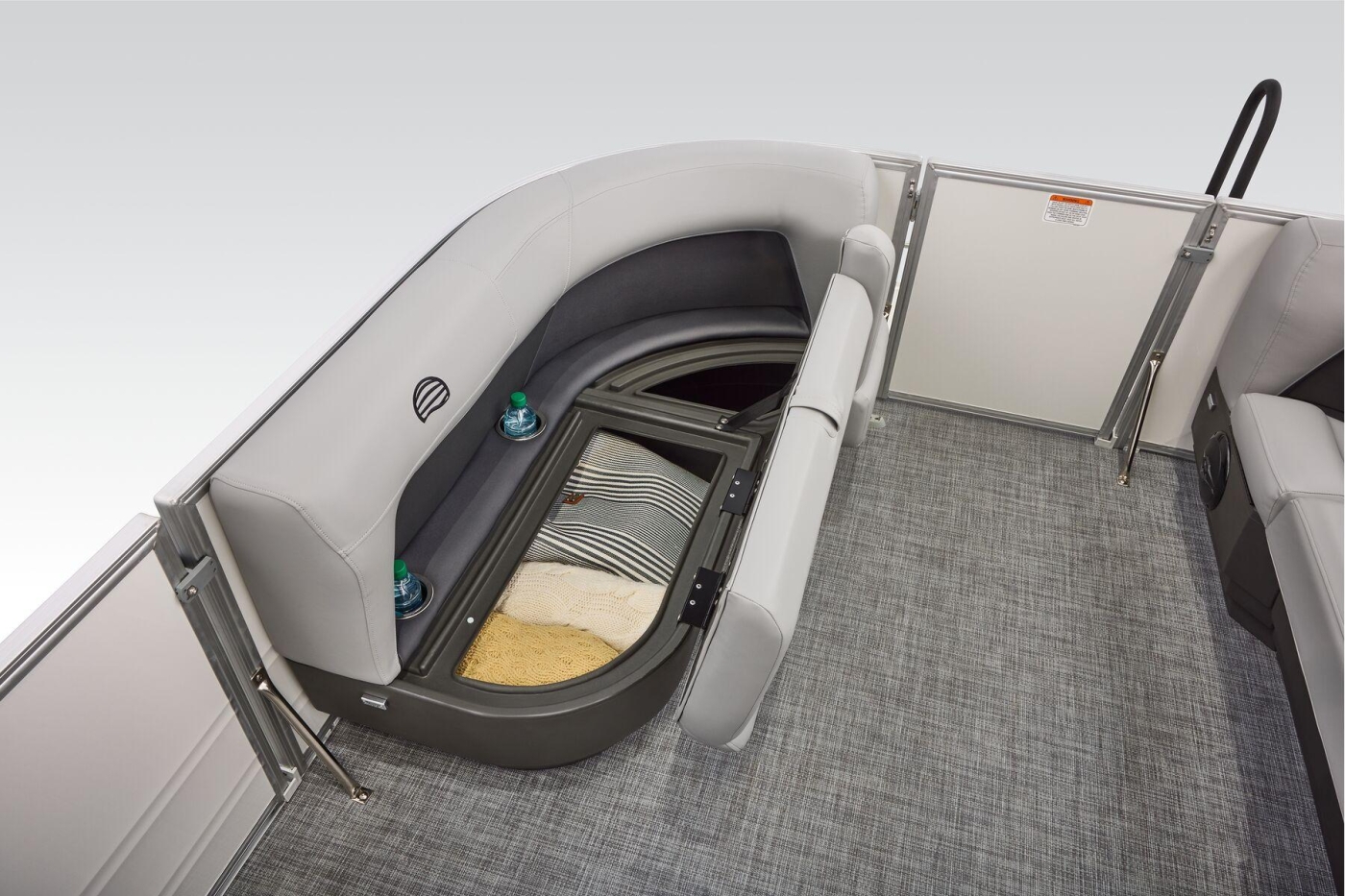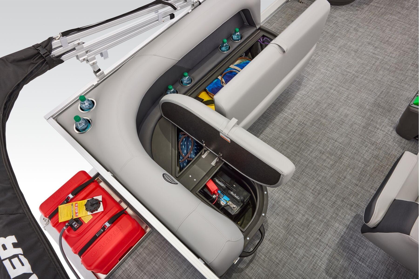 This year's PARTY BARGE gets some slick upgrades. Extra cupholders and storage built into the lounge backrests and improved handles make keeping your supplies at hand easier than ever. A new driver console design creates extra style. The boarding ladder has wider, more ergonomic steps. Crank up the soundtrack of the summer with the standard Bluetooth®-capable Wet Sounds™ stereo and pull up the 7' bimini top to party in the shade when the sun is high. Find your corner of the lake and relax in one of the three corner lounges.