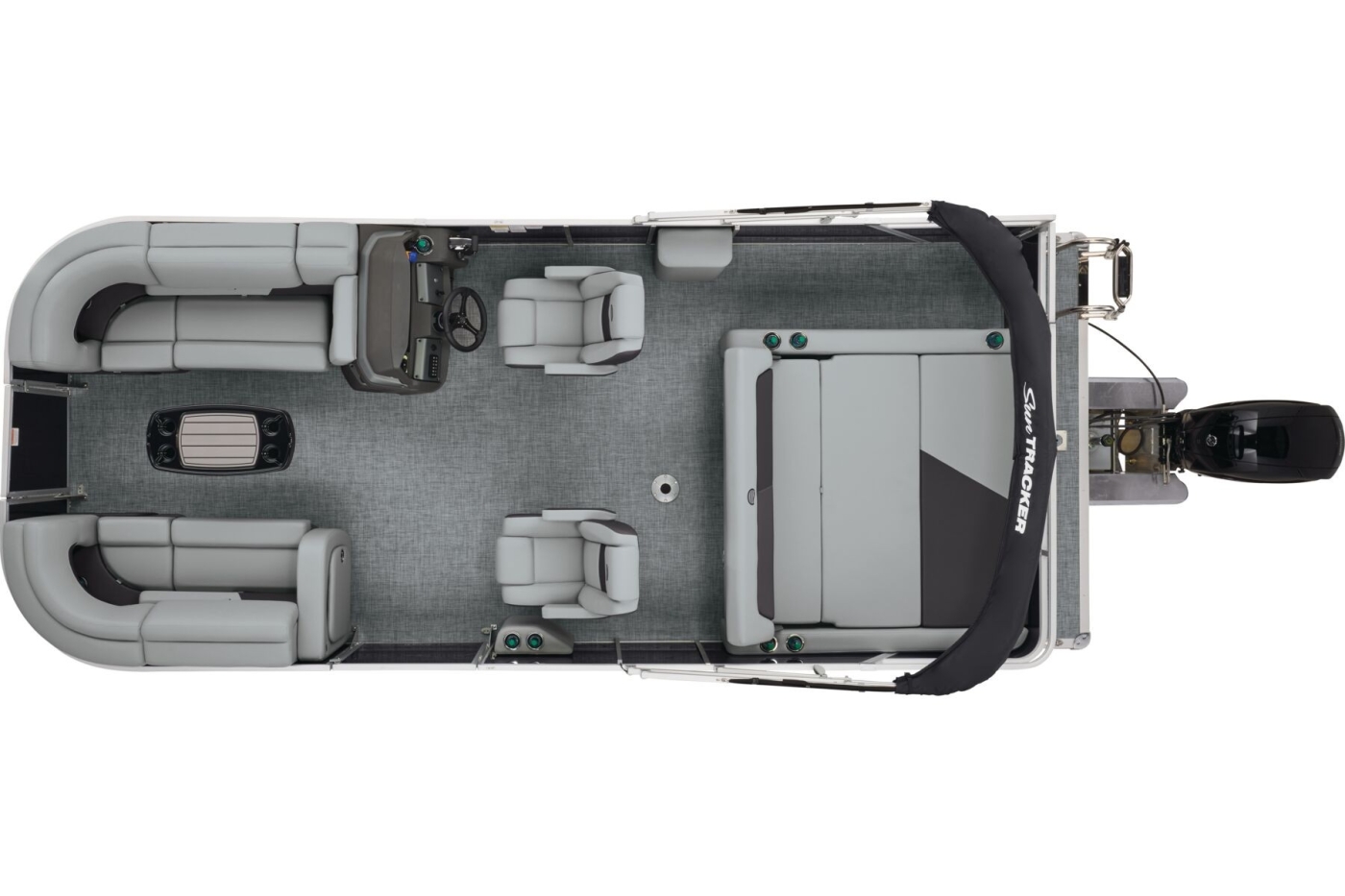 The RF (Rear Facing) version of the 2026 SUN TRACKER® PARTY BARGE® 22 DLX pontoon switches up the deck configuration in a fun way. You still get four ultra-comfortable lounges in the RF DLX, but the aft port lounge is shortened and pushed forward to make room for a double-wide, rear-facing lounge. Every lounge boasts hidden storage compartments that allow you to pack what you need for today’s trip to the lake.
