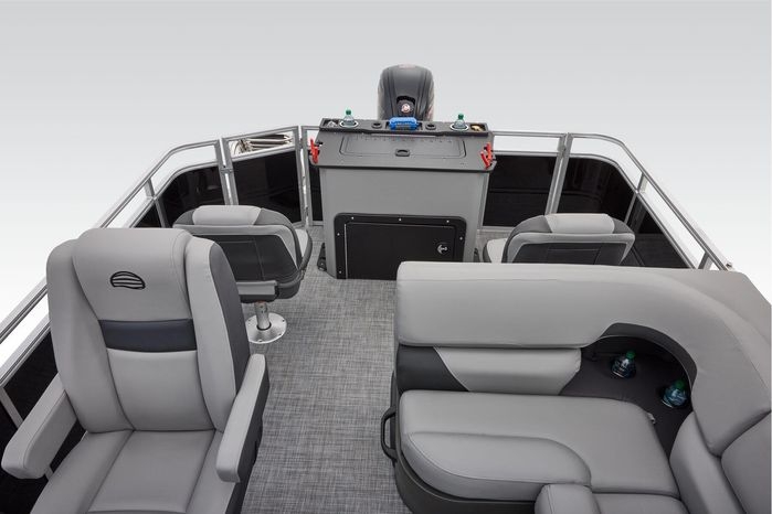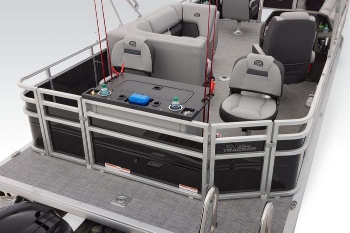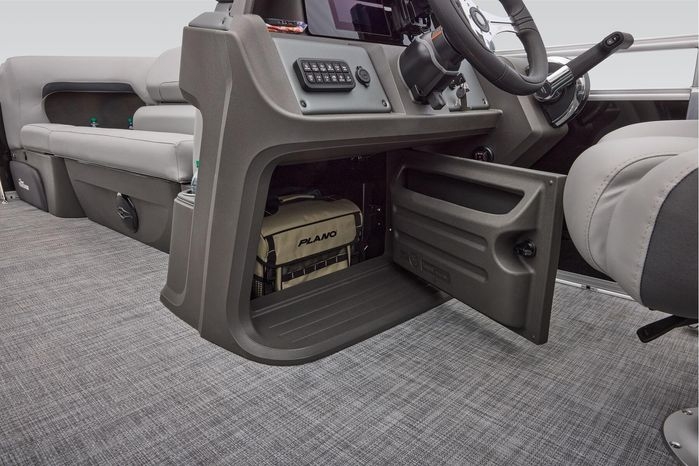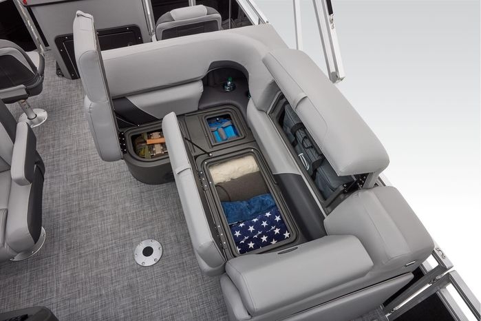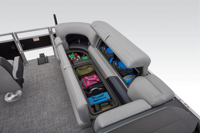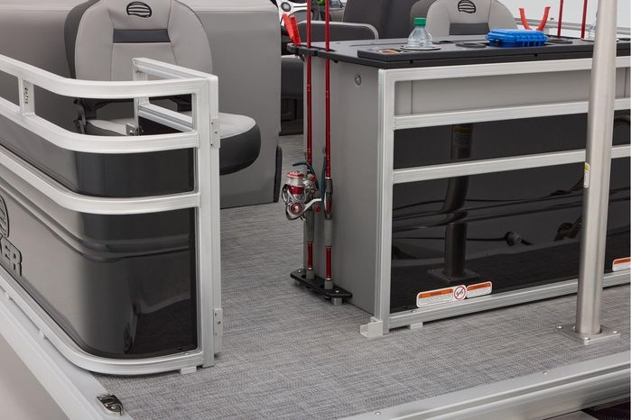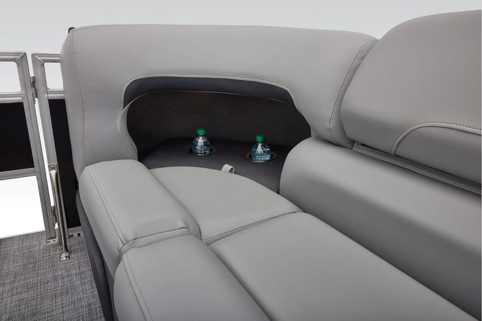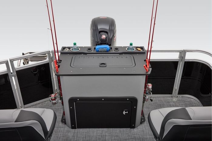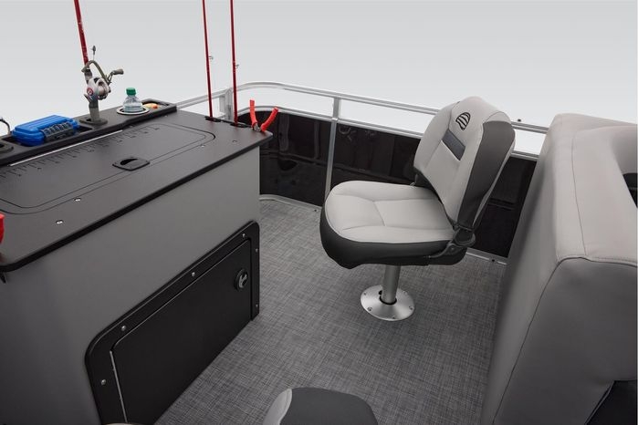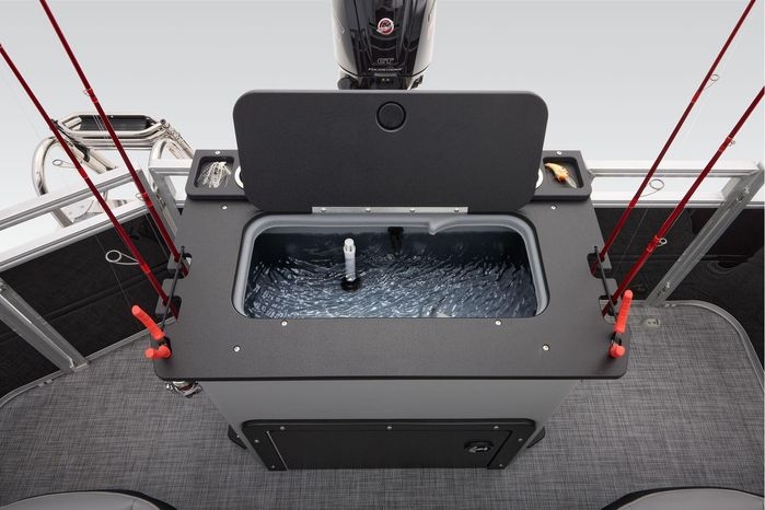 The party for up to 10 people starts with the dual long lounges that boast STOW MORE™ compartments for packing and securing supplies. The 2026 model adds a new, wider ladder that makes reboarding easier. The new year also brings cut-out sections in the backrests that give you more cupholders and space for gear. For the anglers, there are swiveling pedestal fishing chairs on both ends of the pontoon and an 8-gal. aerated livewell complete with a rod holder and a composite lid with an integrated fish ruler.