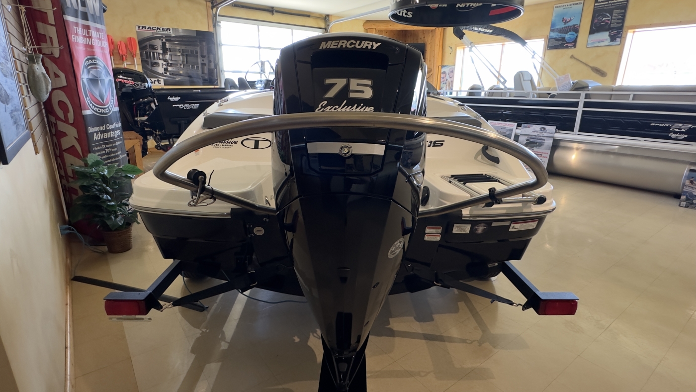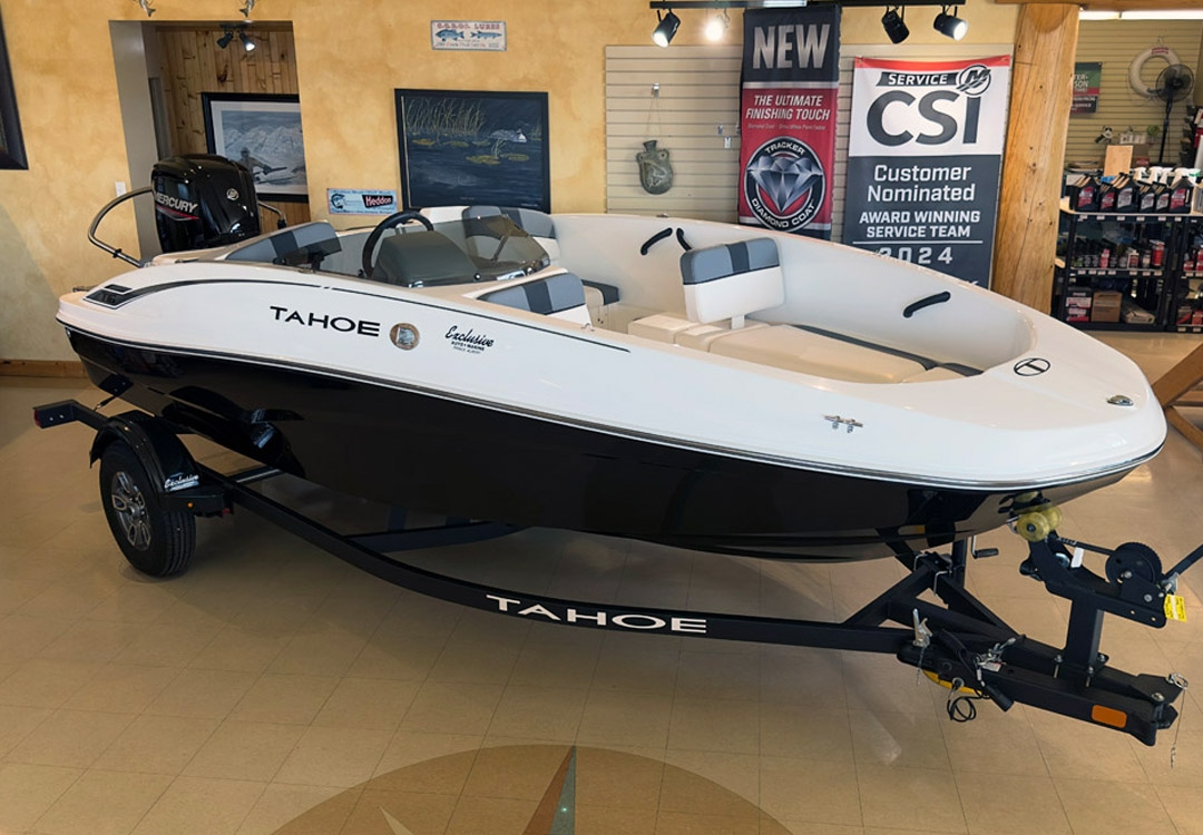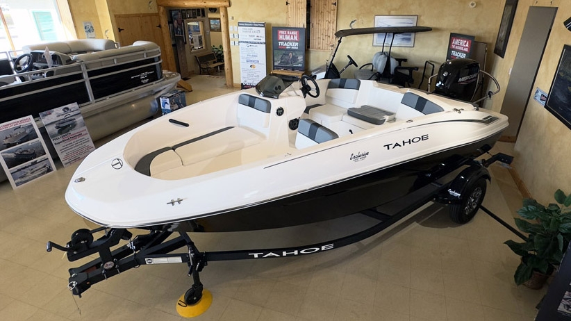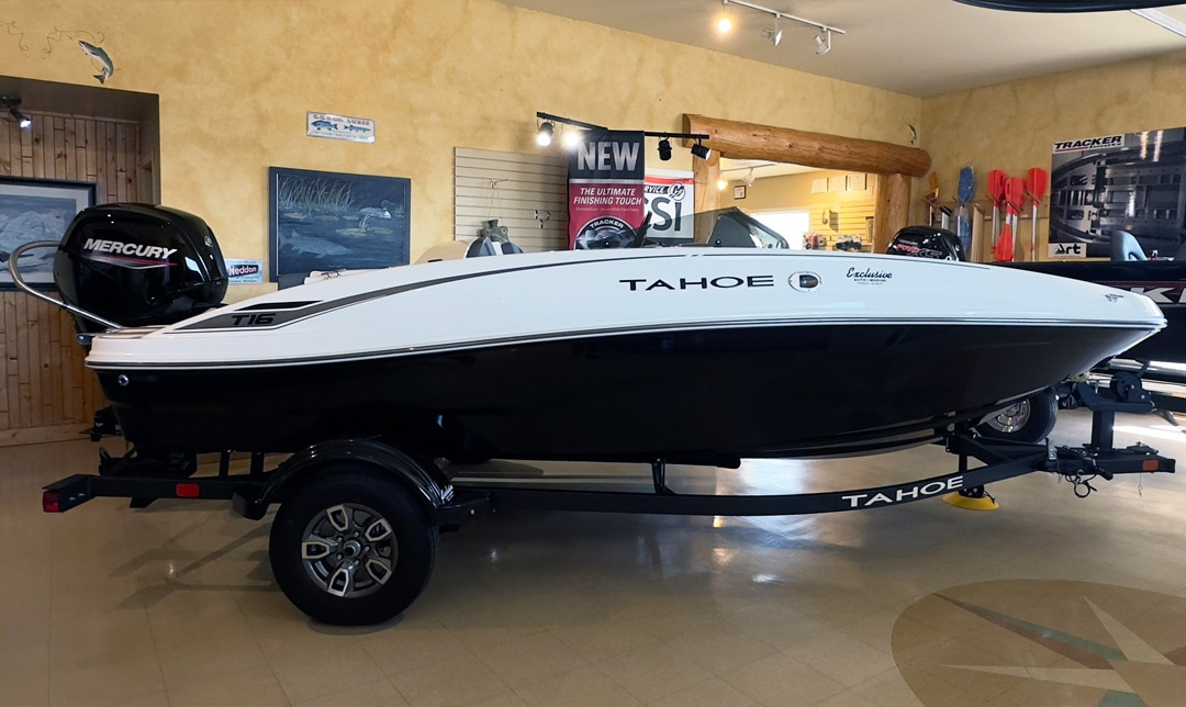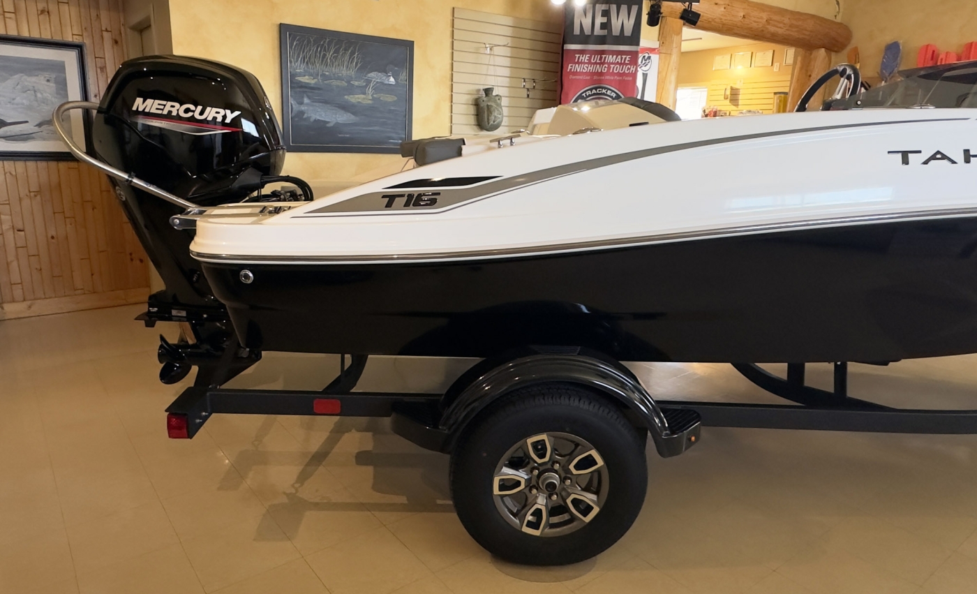 The 2025 TAHOE® T16 comes standard with a 60hp Mercury® ELPT FourStroke outboard motor and has a recommended maximum 75hp rating. This model is packaged with a trailer.
