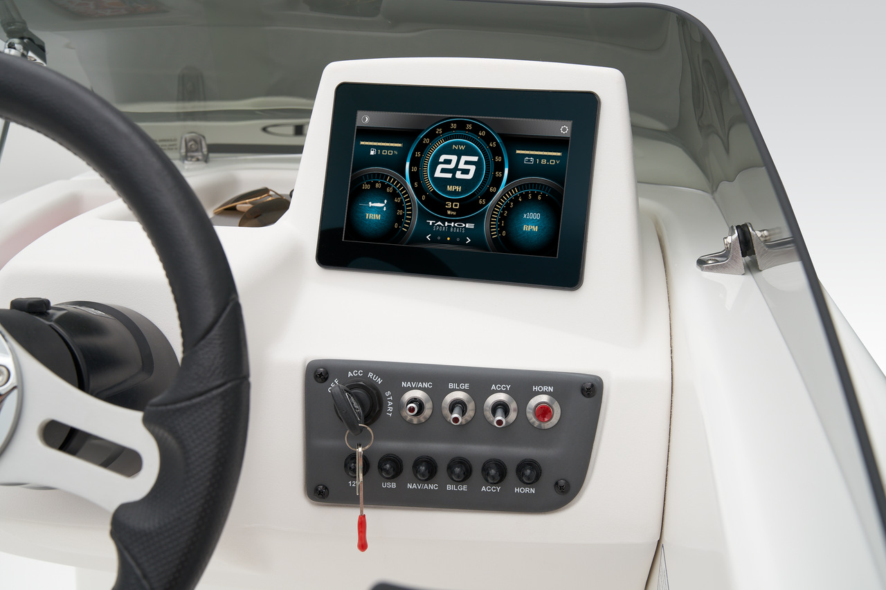 This affordable introduction to the TAHOE® family is a 6-passenger sports boat built to perform. Its POWERGLIDE® hull design features HYDROSTEP strakes that deliver exciting and stable riding experiences. Use the 7" TAHOE CRUISE touch screen to monitor GPS-accurate speed, water depth, your motor's vitals, and more. Opt for the available TurboSwing® to prepare your T16 for watersports.
