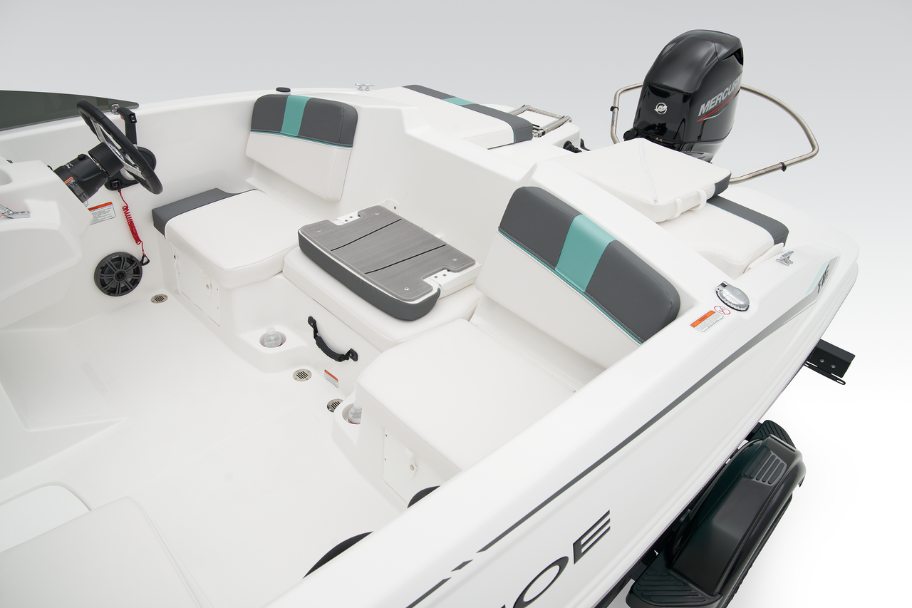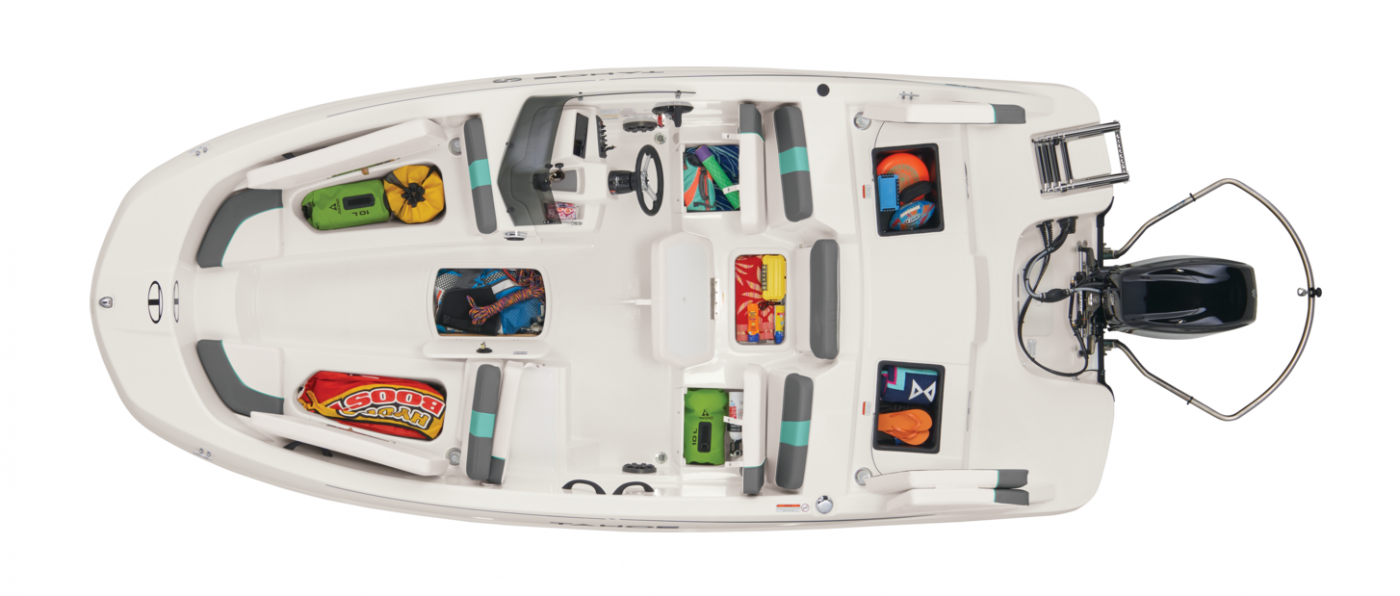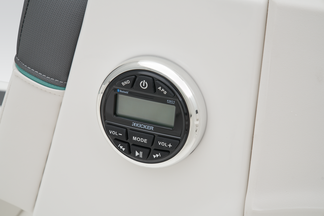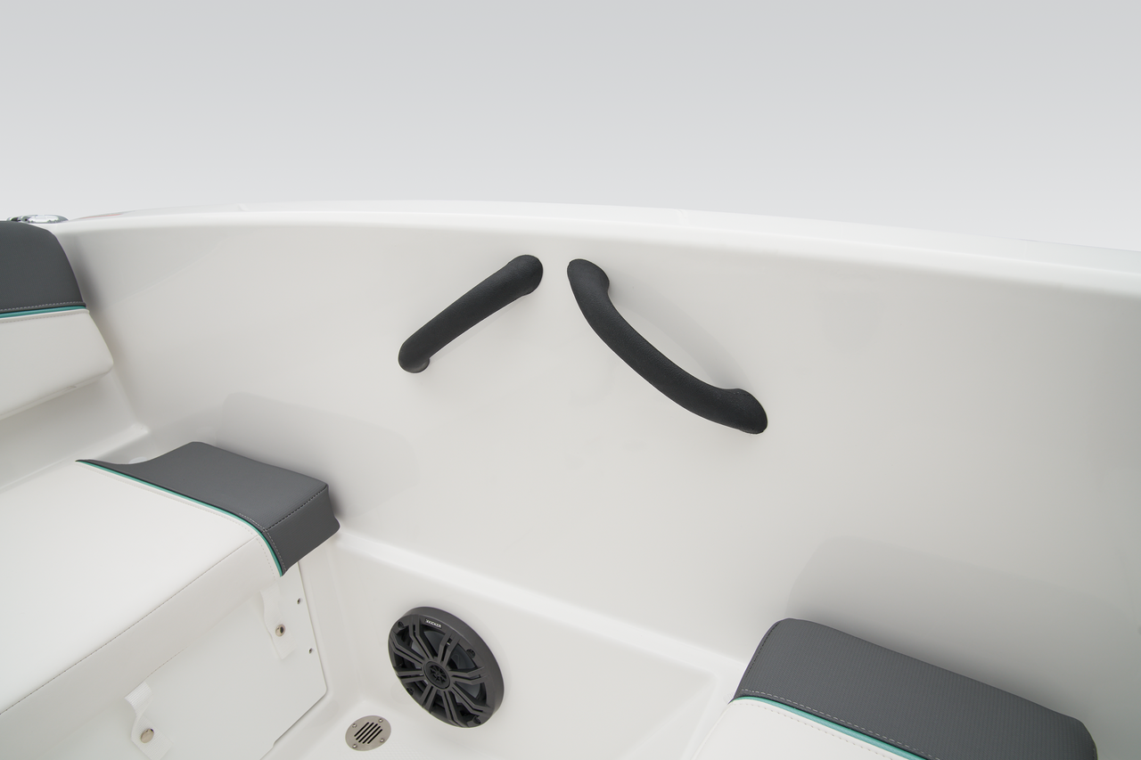 Relax on the water in this boat's midship bench seating and twin forward lounges with under-seat storage. The bow seats have reversible backrests that turn them into spotter seats. Lay out on the aft sun pad when you find your cove. The 4-step telescoping aft boarding ladder makes it easy to get back on the swim platform after diving into the water. Flip-up seat cushions and flip-down seat backs let passengers board the boat without stepping on upholstery. Claim 1 of the 9 drink holders, find your song on the 2-speaker Kicker® stereo, and search for excitement on the water!