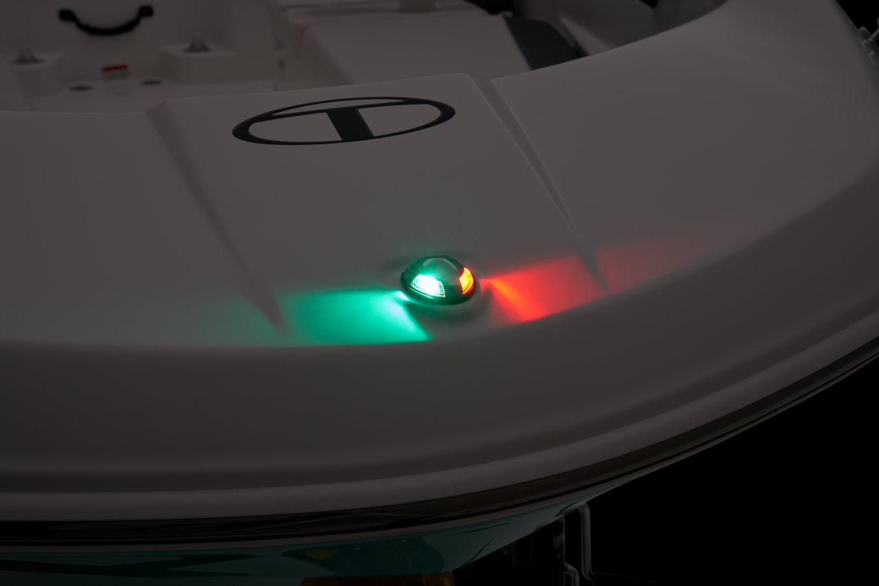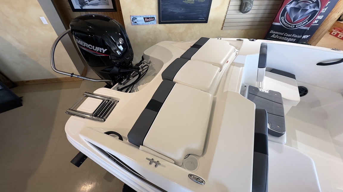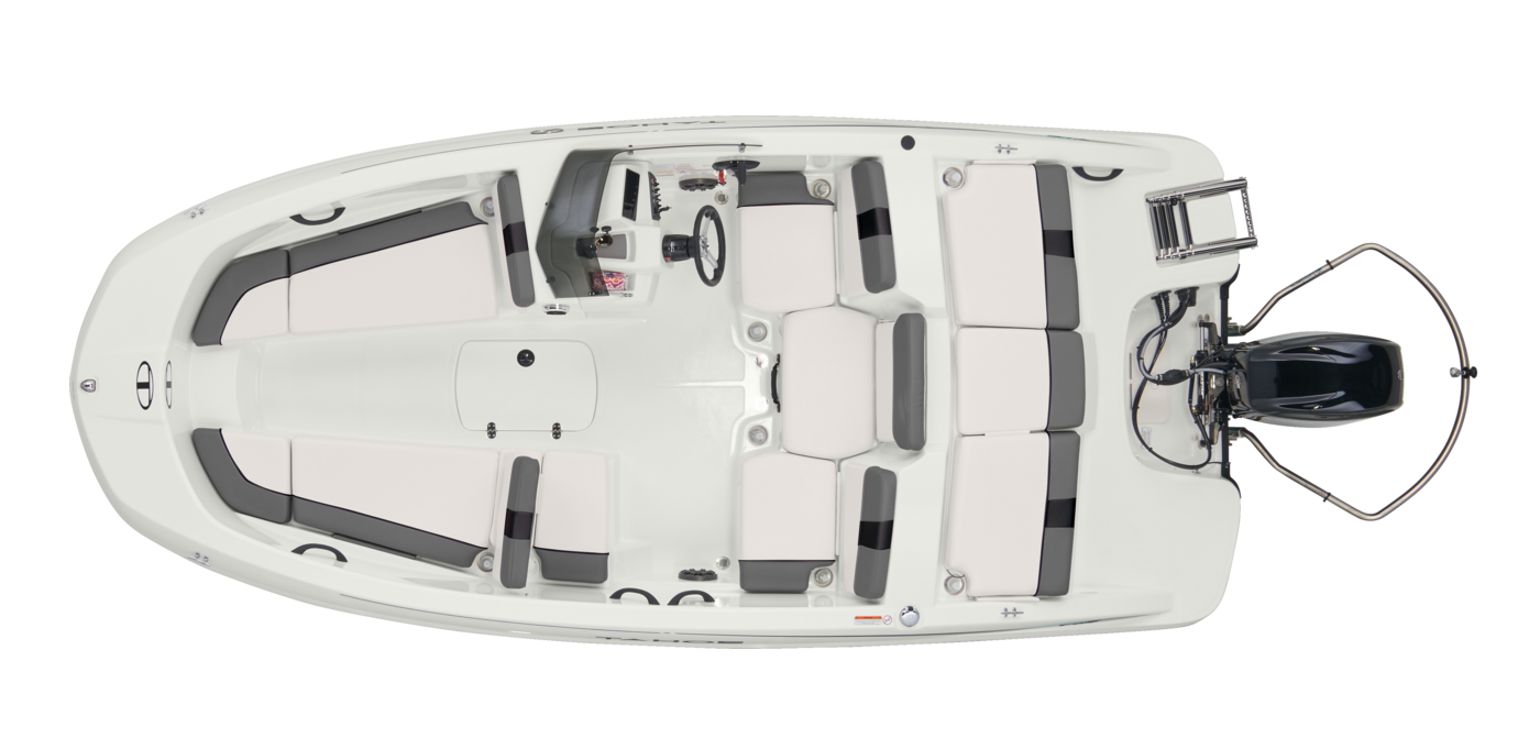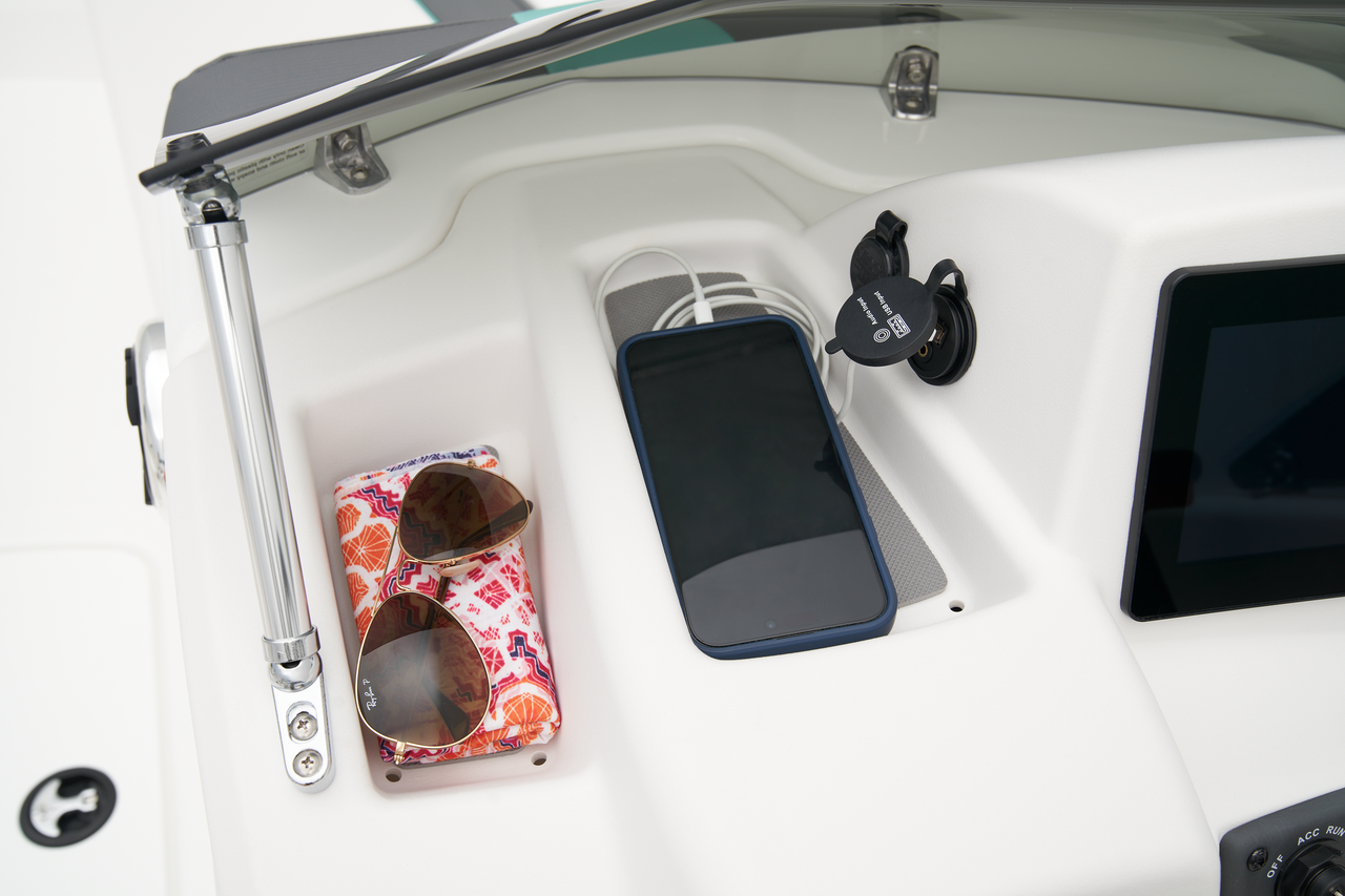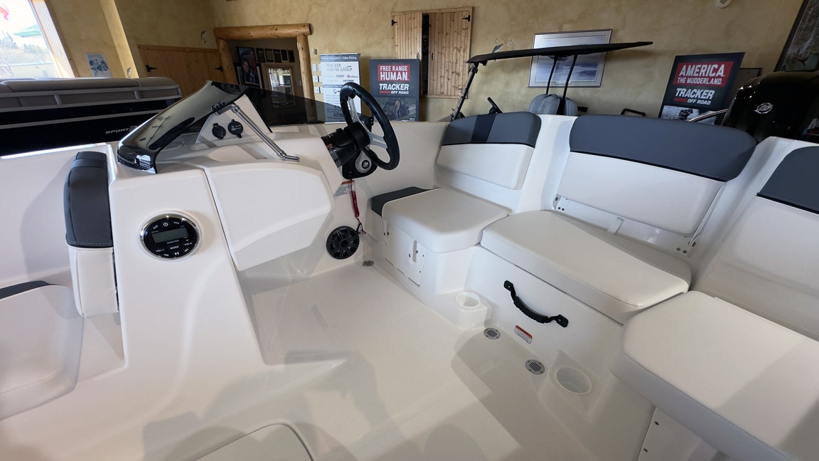 Relax on the water in this boat's midship bench seating and twin forward lounges with under-seat storage. The bow seats have reversible backrests that turn them into spotter seats. Lay out on the aft sun pad when you find your cove. The 4-step telescoping aft boarding ladder makes it easy to get back on the swim platform after diving into the water. Flip-up seat cushions and flip-down seat backs let passengers board the boat without stepping on upholstery. Claim 1 of the 9 drink holders, find your song on the 2-speaker Kicker® stereo, and search for excitement on the water!