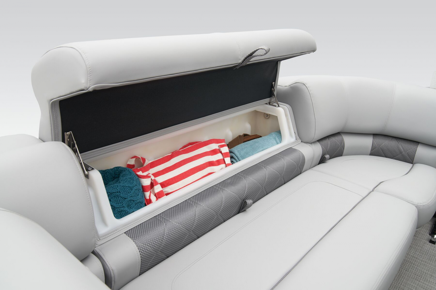 - Wraparound bow port & starboard lounges w/extra-deep cushions, pillowtop backs, lumbar support & lockable storage