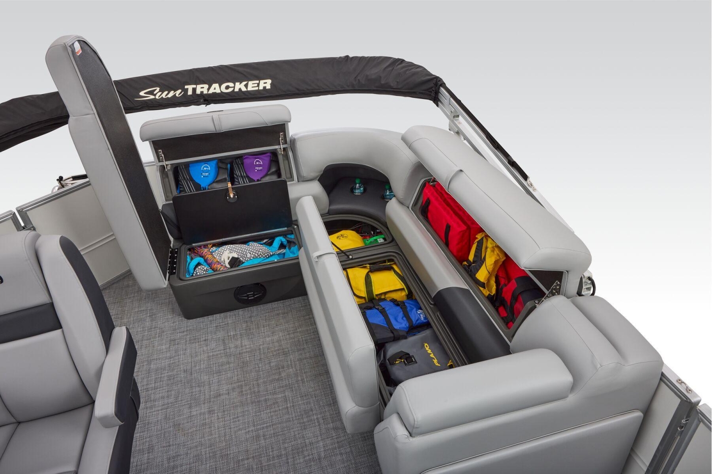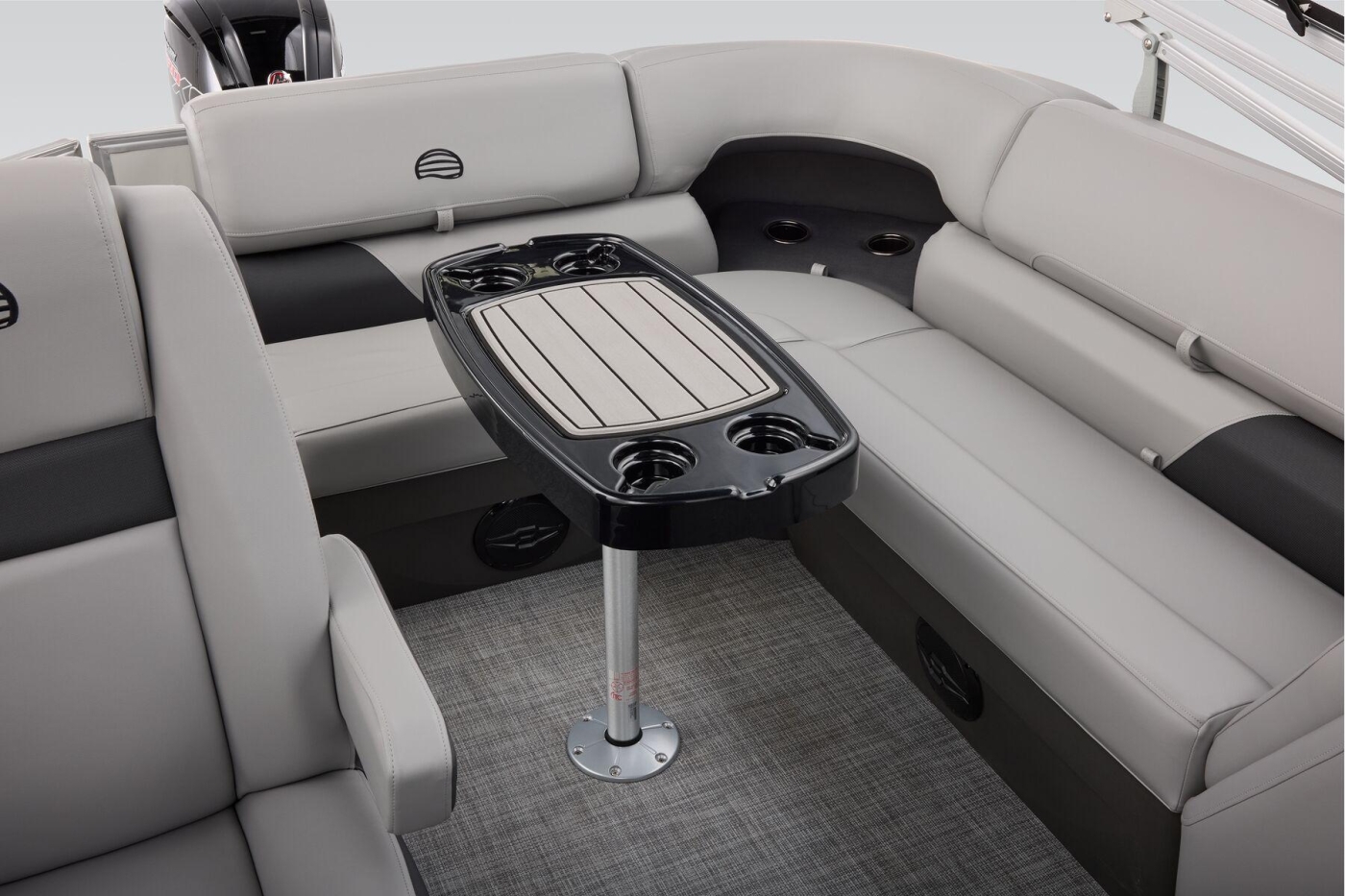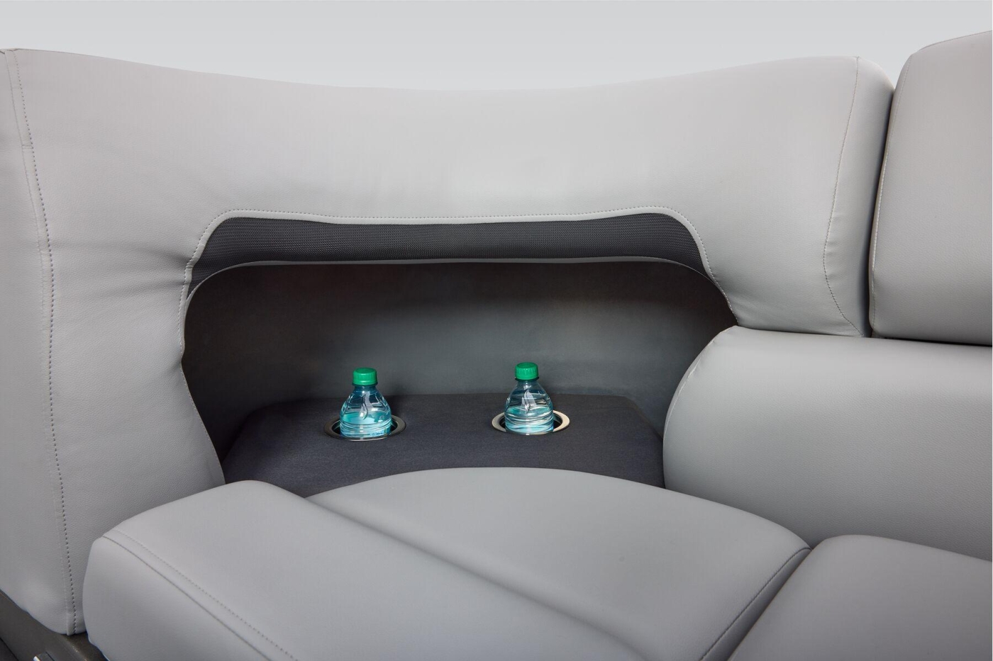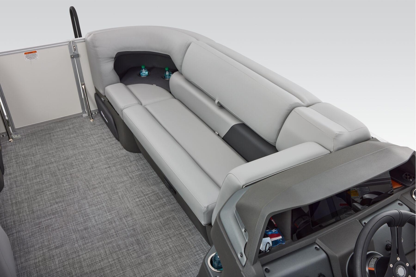Some exciting new changes come with the 2026 model! The captain's console has received a complete facelift. The three corner lounges give your passengers plenty of space to relax in. These lounges have new accents that match the fence colors and also sport great new corner storage cubbies with more cupholders. Lift those pillow-top seats to reveal hidden storage compartments.