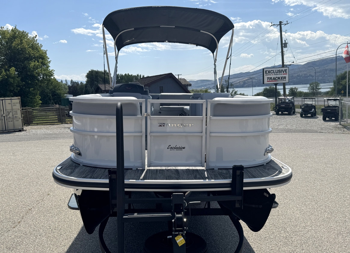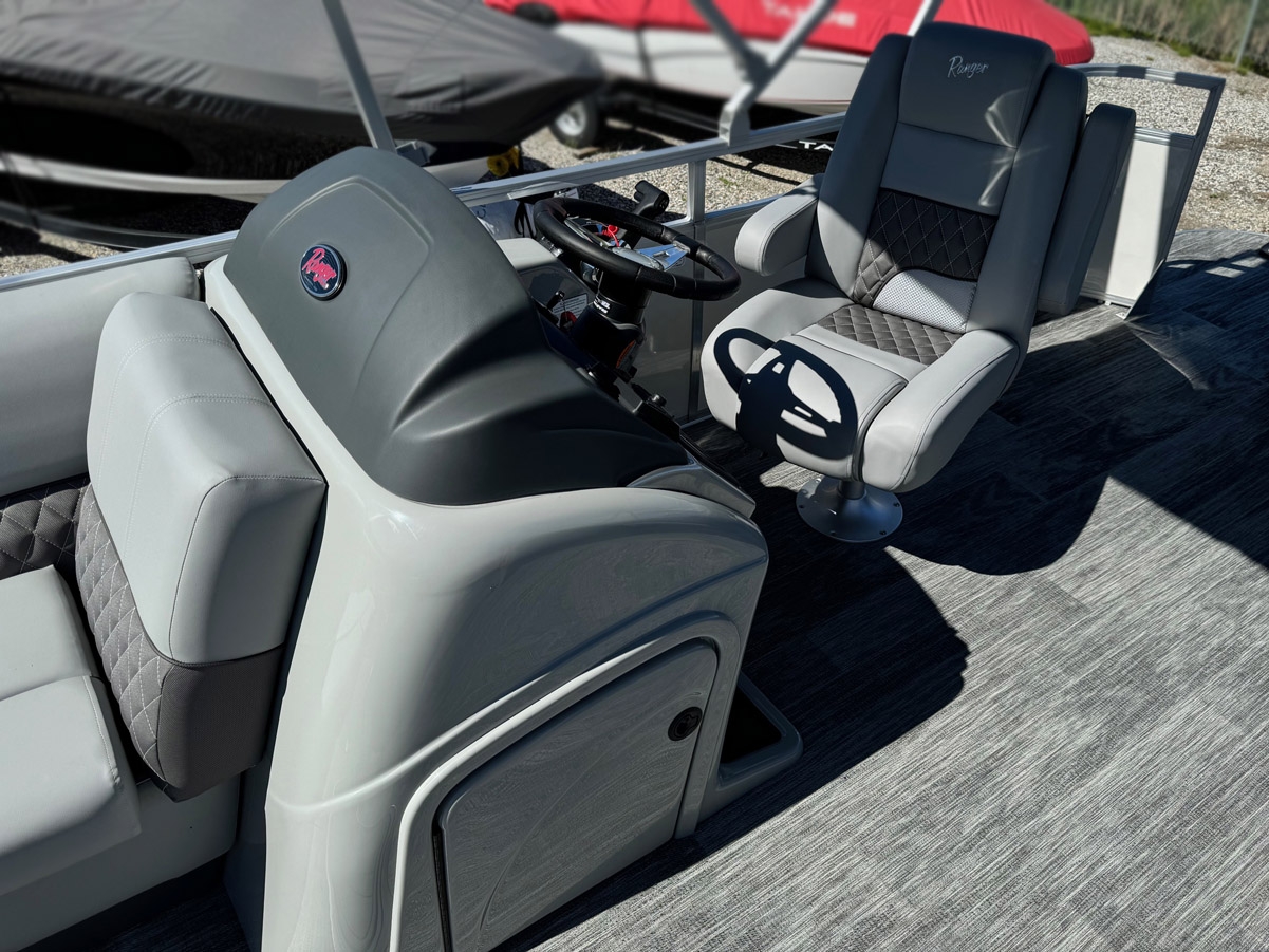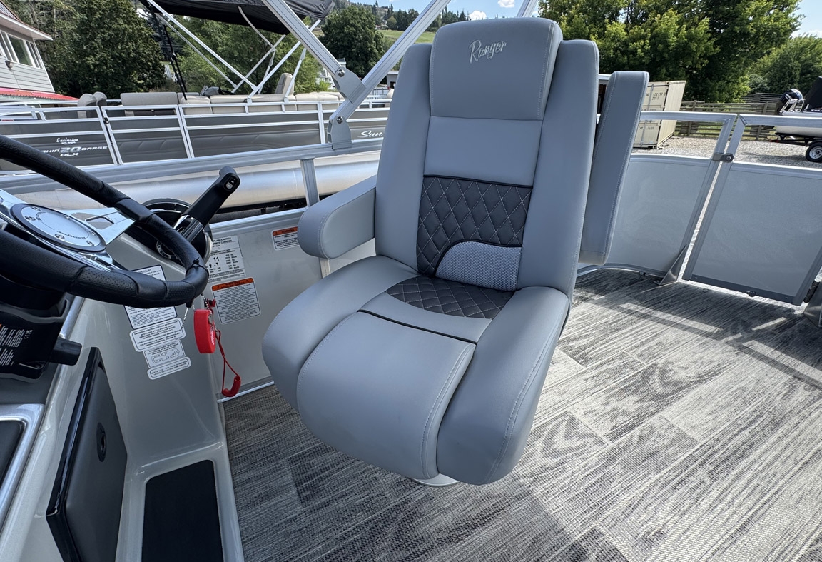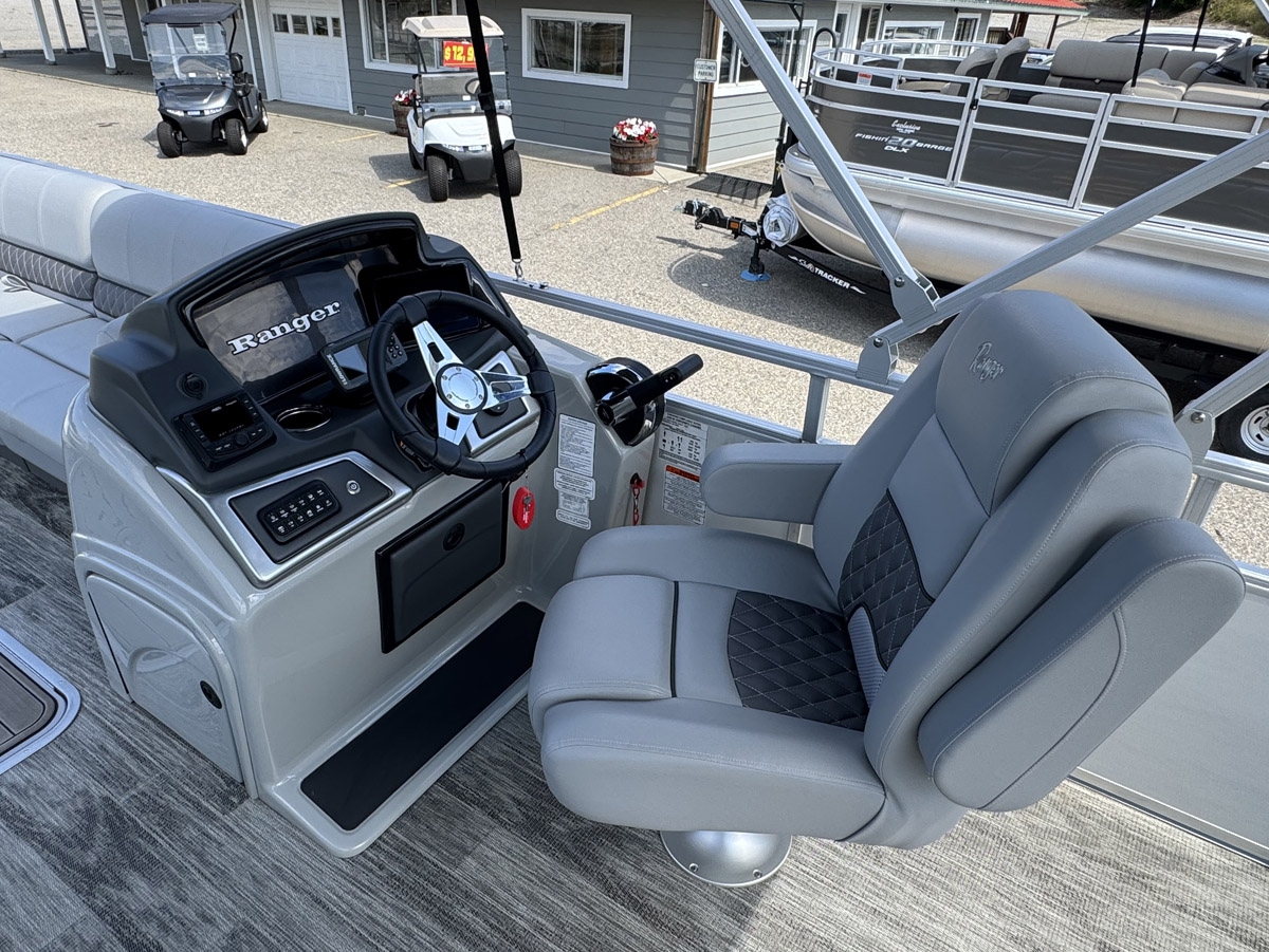 Smooth, solid power, refined luxury and maximum convenience define the Ranger® Reata® 223C. With three powder-coated pontoons, hand-crafted seating and a Dowco EasyLift™ 10-foot Bimini top, this pontoon is ready to move you in comfort and style. A full-width rear swim platform with boarding ladder are adjacent to the PowerPod™ motor extension that delivers enhanced performance and a quieter ride. Within the redesigned gates is luxury from top to bottom, from the soft-touch woven flooring to the extra-plush lounges and overstuffed captain’s chair. Storage beneath every seat and under the console easily hold a day’s worth of gear while a 200-horsepower rating ramps up excitement on demand. With so much capability, the Ranger 223C delivers high performance, even at 0 MPH.