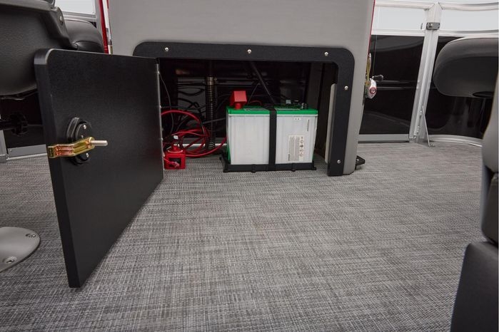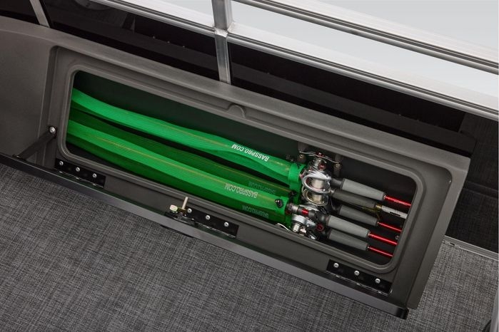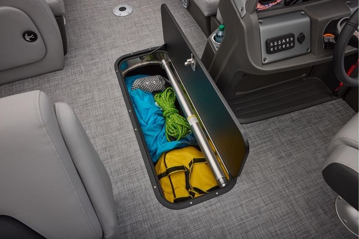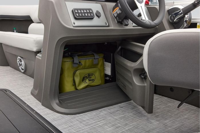 Unlock the rod box—which fits six 7'6" rods—and pull out your favorite combo. Post up in one of the two removable and folding fishing chairs in the aft fishing deck, which boasts a under-couch livewell and tackle storage compartment. Two forward couches and an L-shaped lounge under a standard 10' bimini top provide cool shade and plenty of space to relax. The 2026 model year offers a wider boarding ladder and backrest cubbies with extra storage and cupholders.