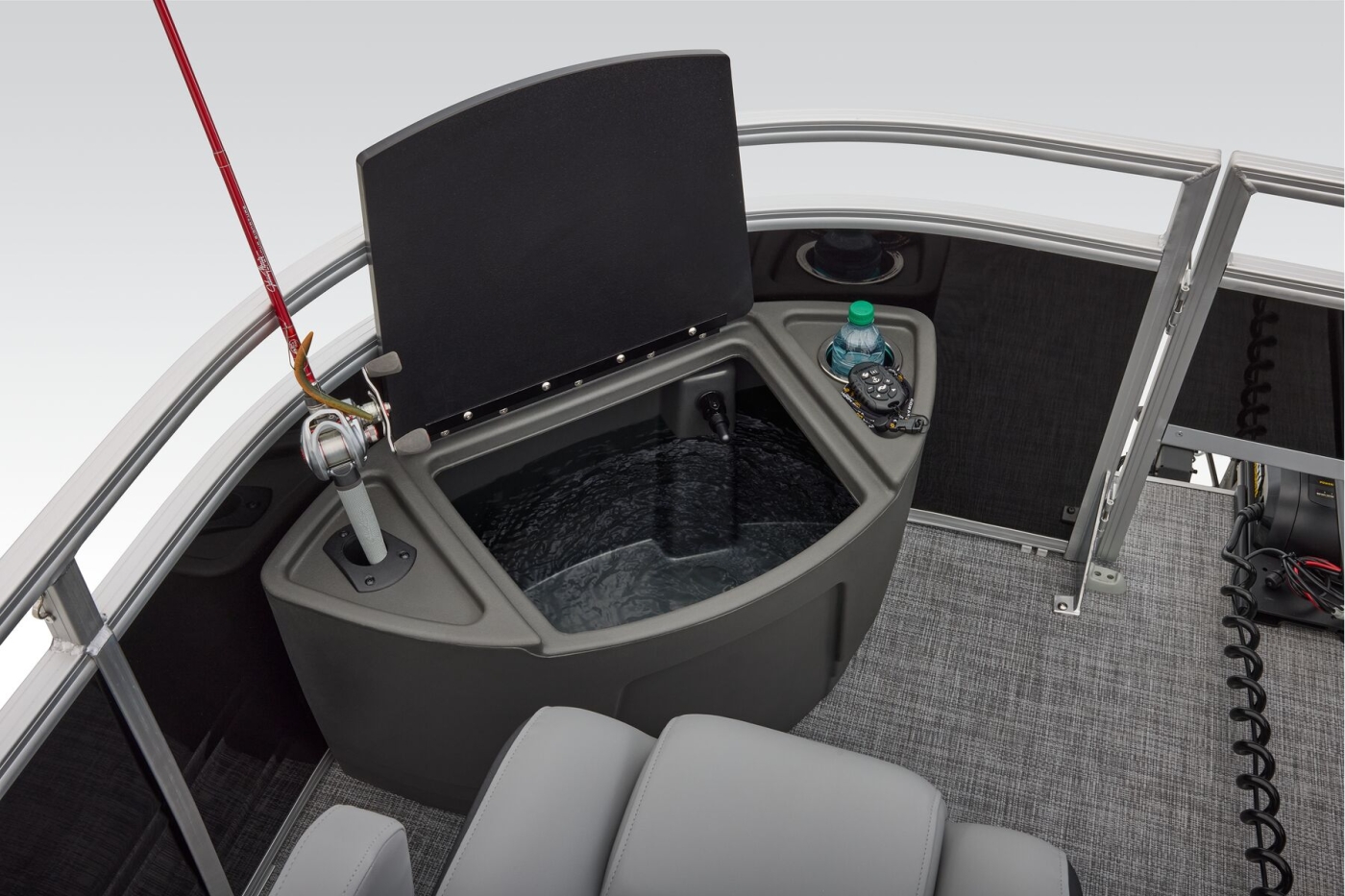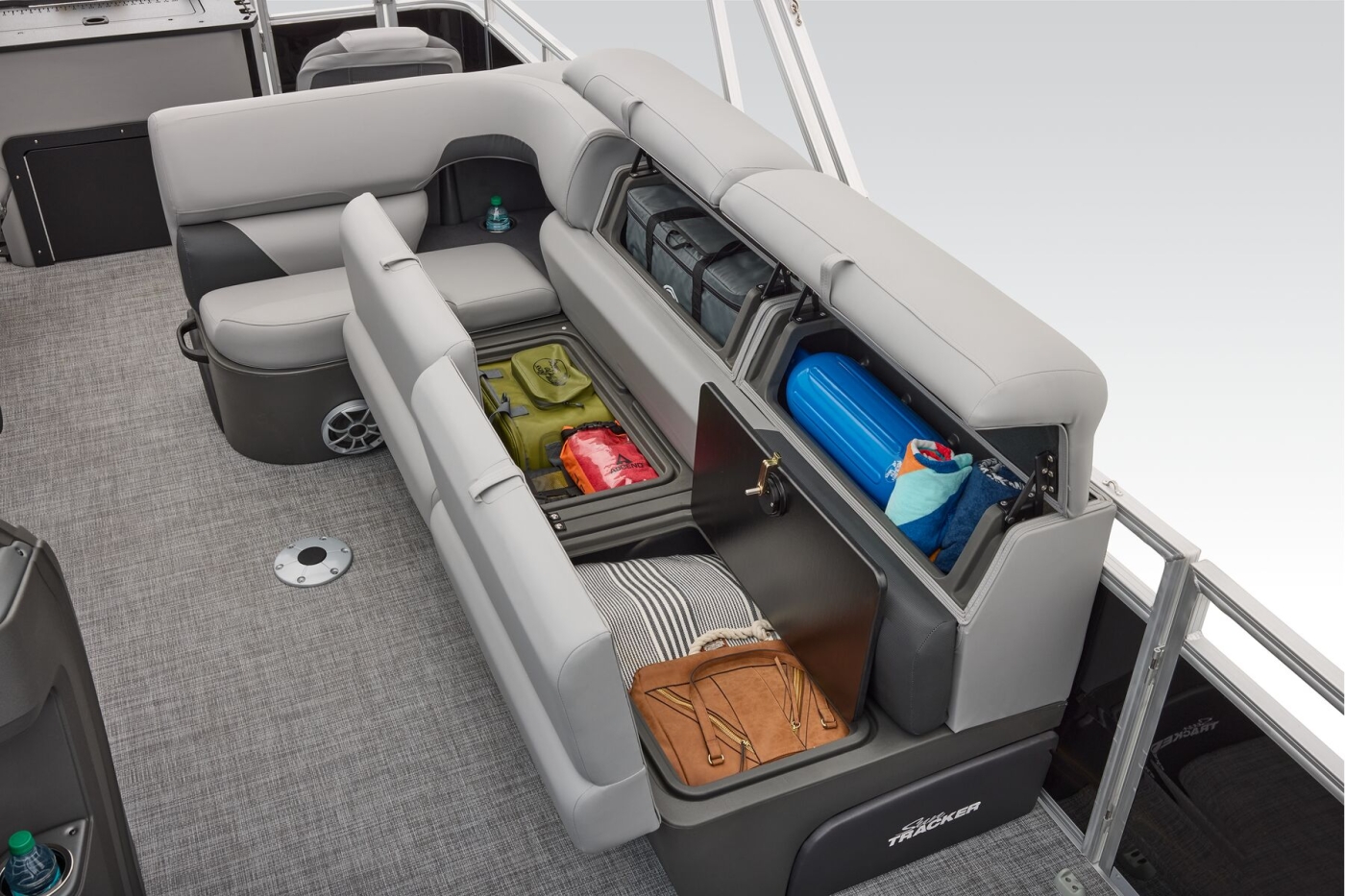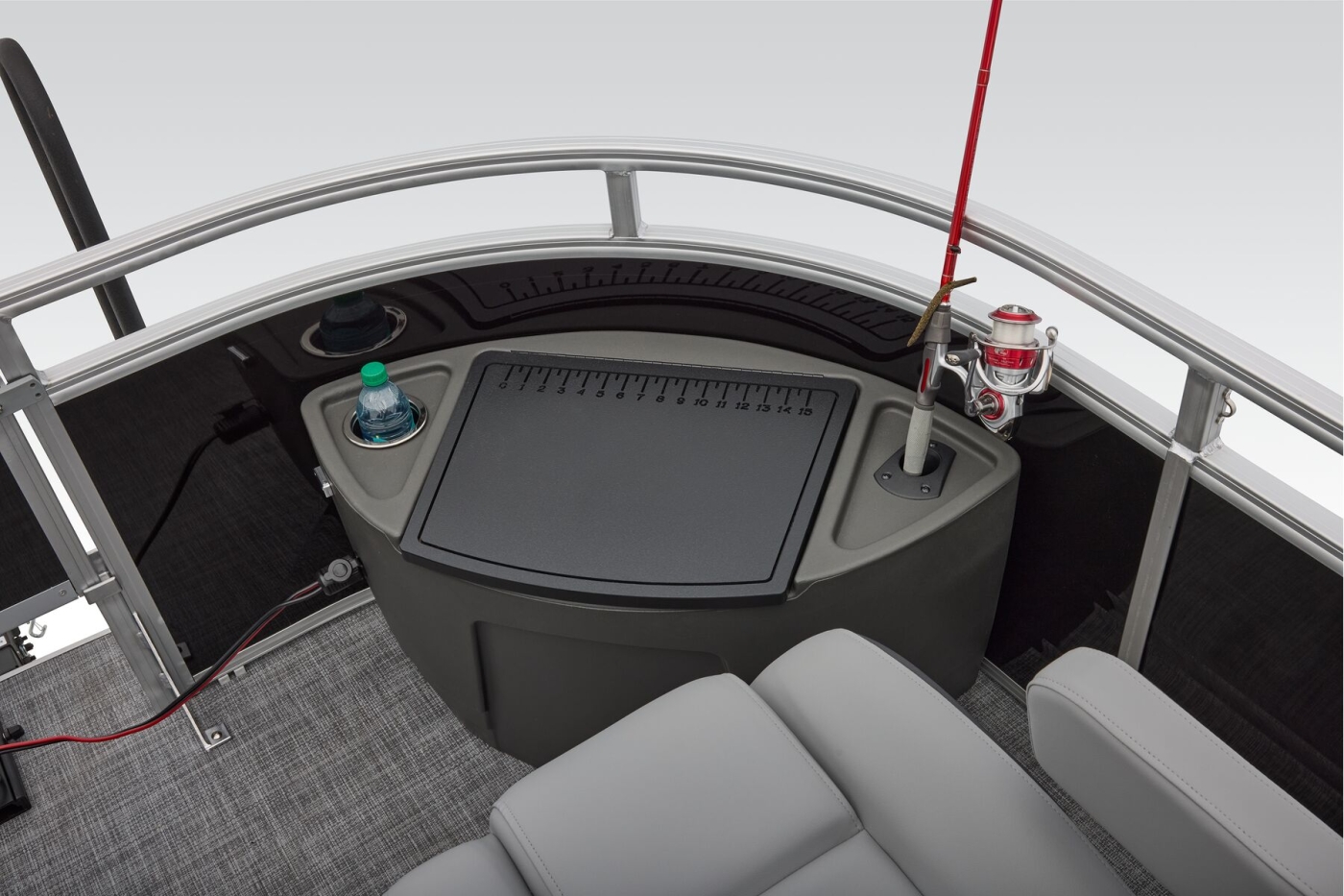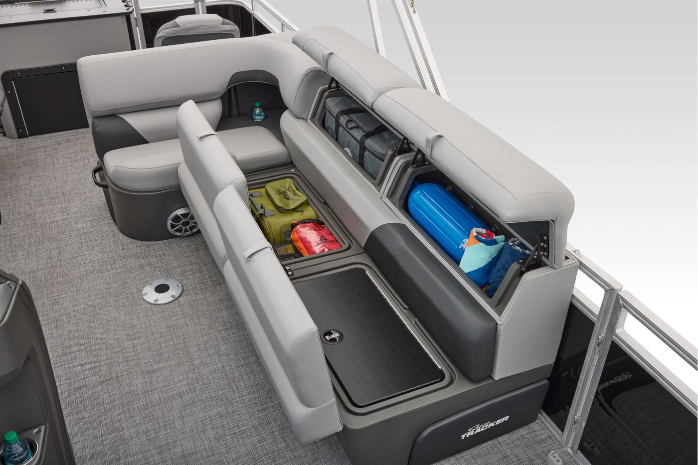 Three pontoon logs deliver massive boosts in power and stability for full days of thrills and relaxation. The front fishing deck gives you two folding and removable fishing chairs, a rail-mounted rod and tool holder, and a starboard storage compartment that boasts a cupholder, rod holder, and a composite lid with a fish ruler. On the port side, you’ll find a 16-gal. aerated livewell with a drink and rod holder, as well as an integrated fish ruler. A deck full of couches, a bench, and an aft bed with hidden storage compartments under a retractable 10 ' bimini top deliver ultimate relaxation.