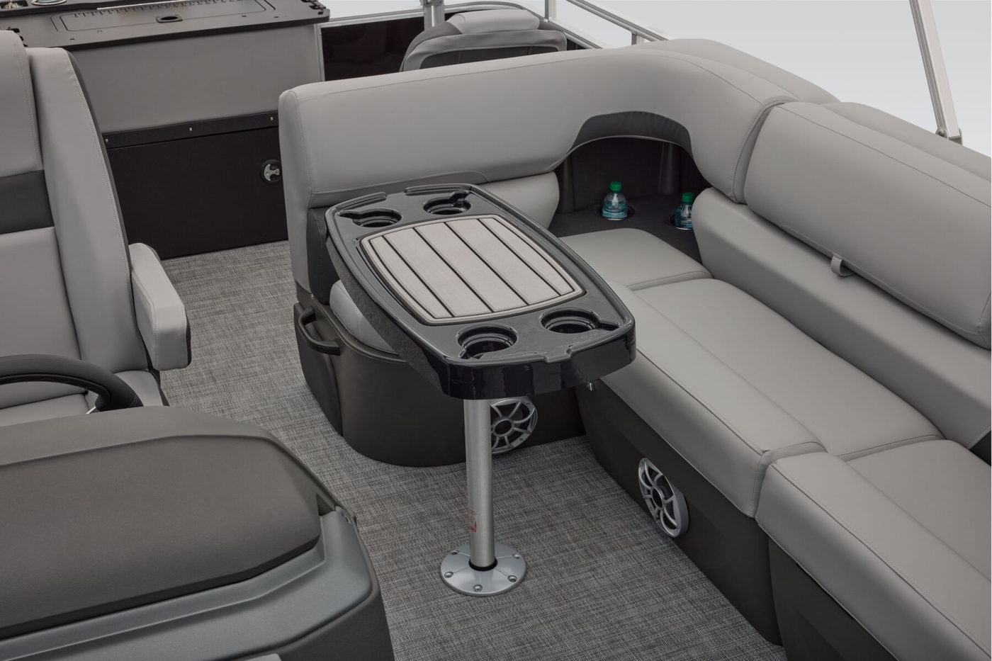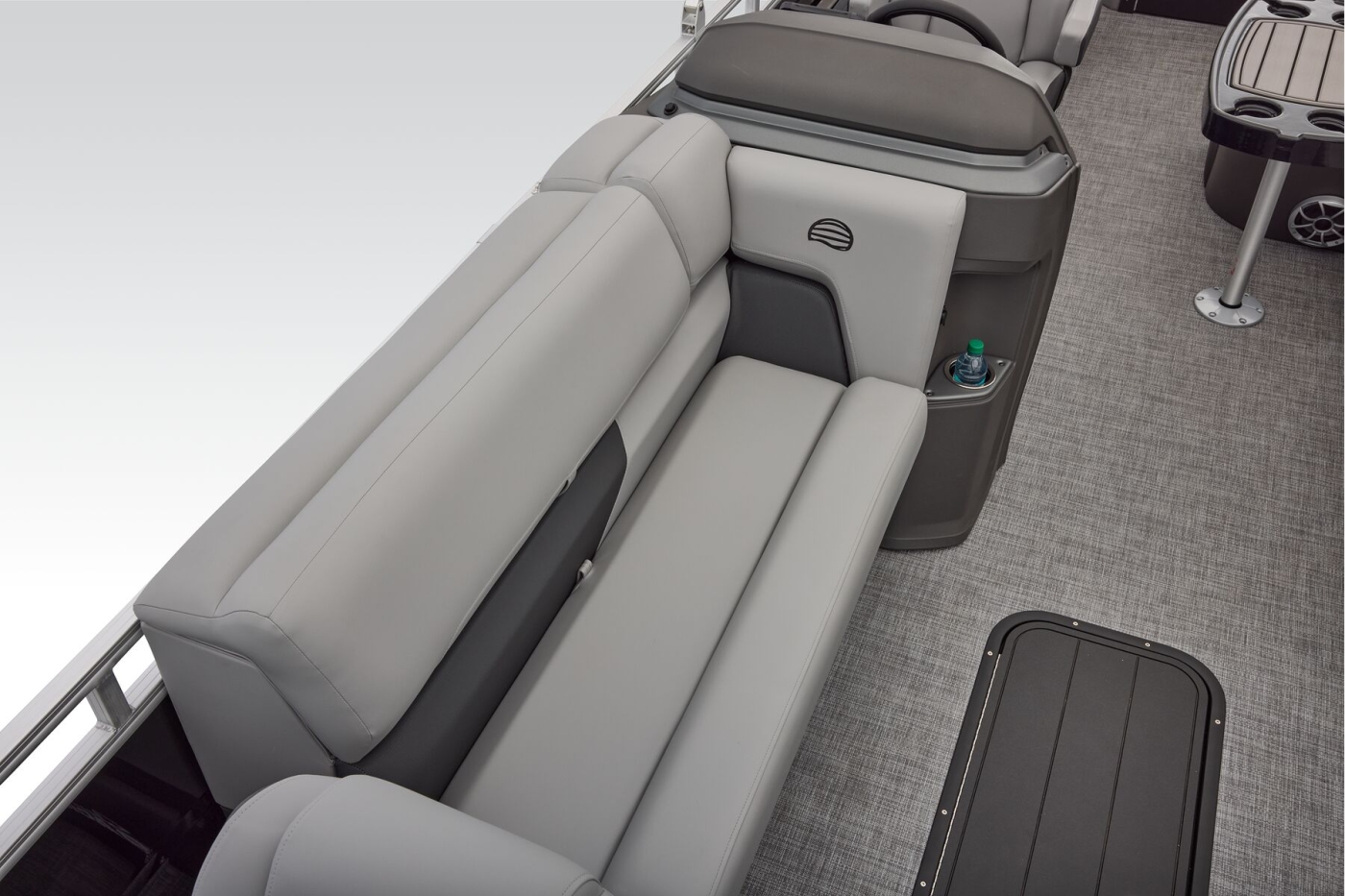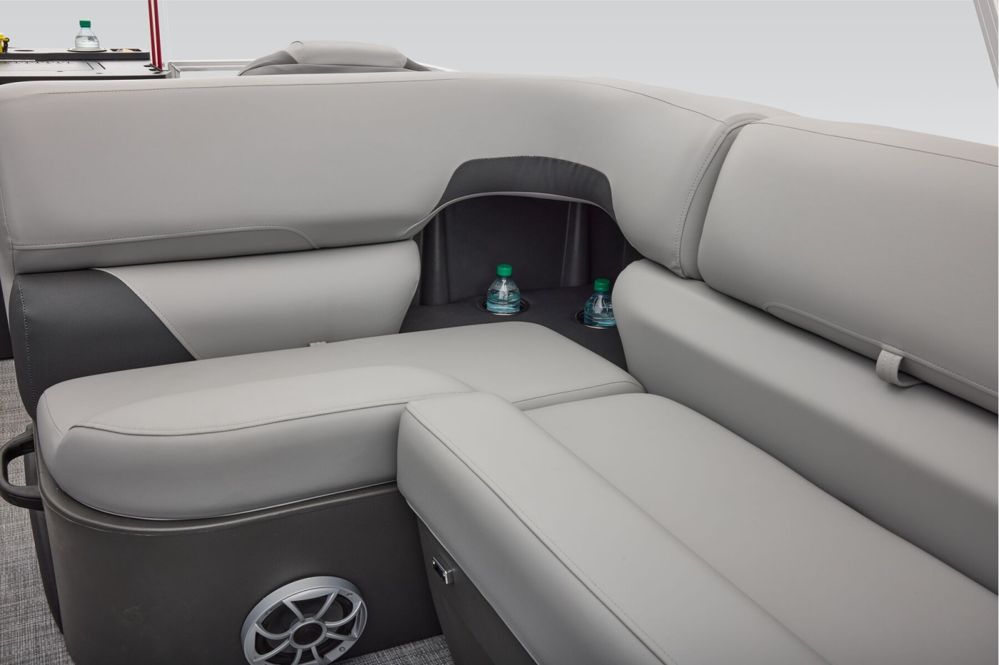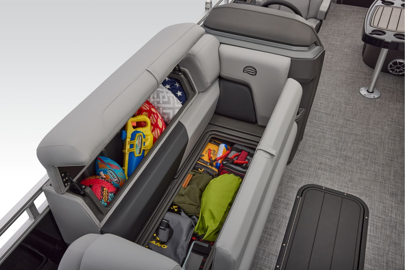 Three pontoon logs deliver massive boosts in power and stability for full days of thrills and relaxation. The front fishing deck gives you two folding and removable fishing chairs, a rail-mounted rod and tool holder, and a starboard storage compartment that boasts a cupholder, rod holder, and a composite lid with a fish ruler. On the port side, you’ll find a 16-gal. aerated livewell with a drink and rod holder, as well as an integrated fish ruler. A deck full of couches, a bench, and an aft bed with hidden storage compartments under a retractable 10 ' bimini top deliver ultimate relaxation.