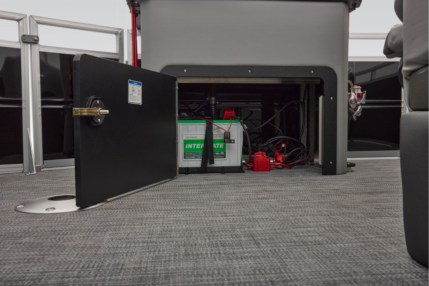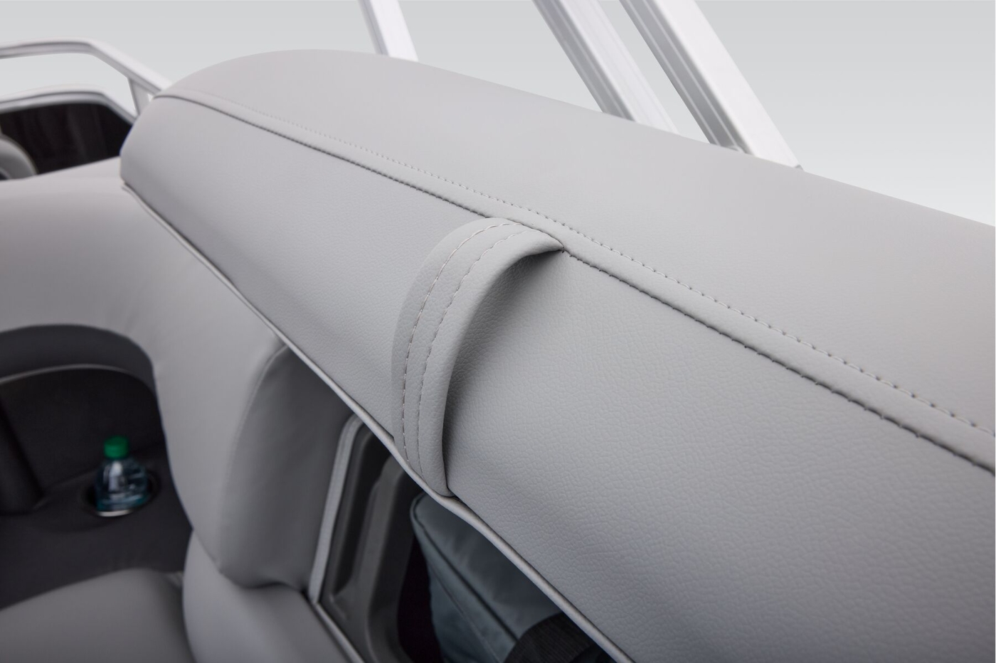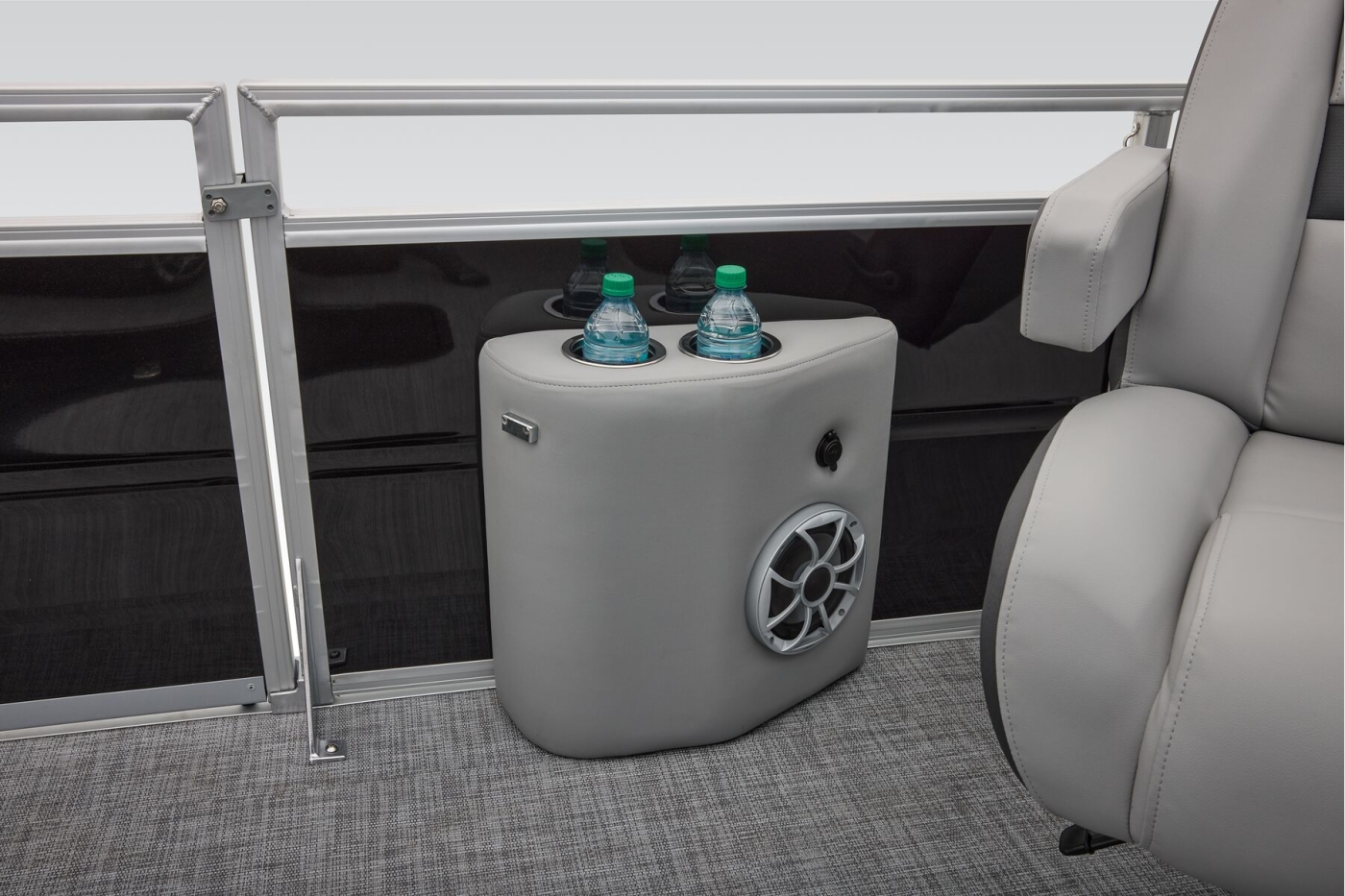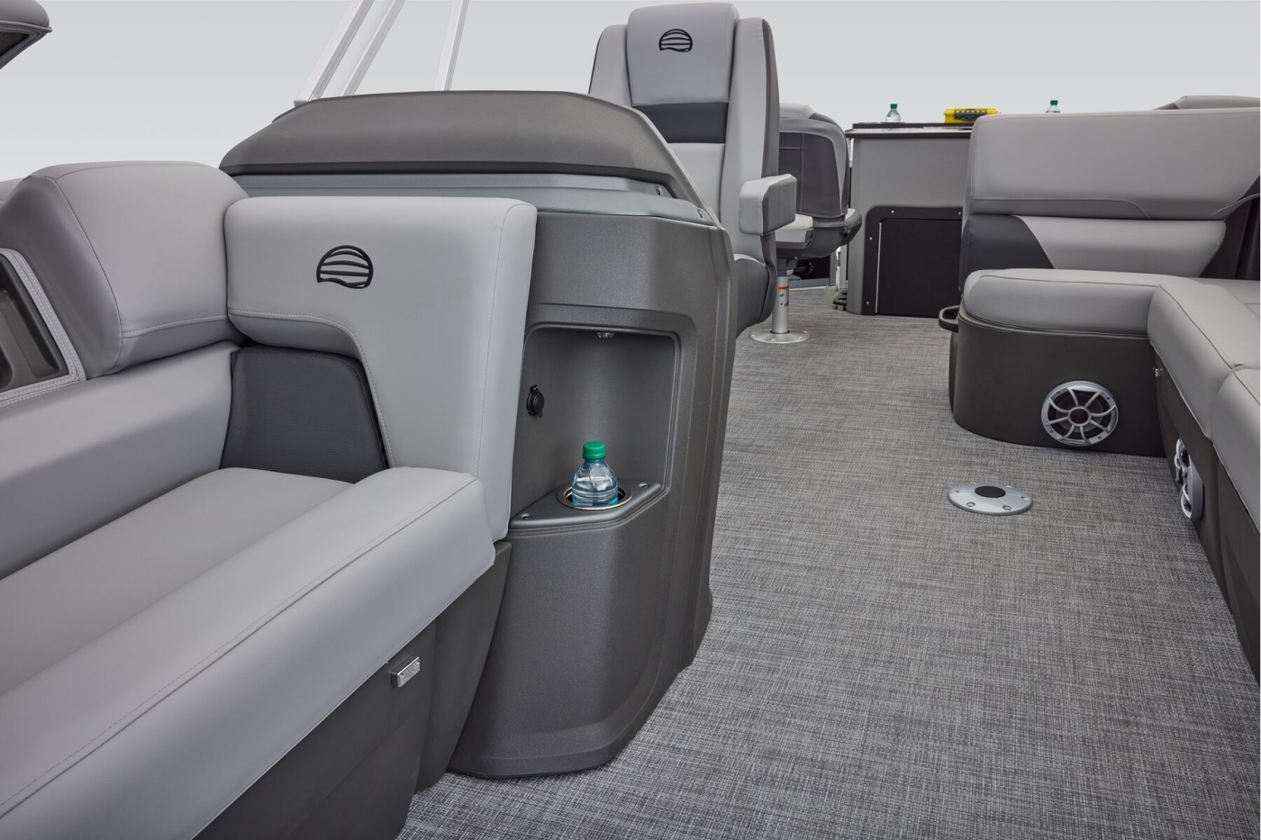 Three pontoon logs deliver massive boosts in power and stability for full days of thrills and relaxation. The front fishing deck gives you two folding and removable fishing chairs, a rail-mounted rod and tool holder, and a starboard storage compartment that boasts a cupholder, rod holder, and a composite lid with a fish ruler. On the port side, you’ll find a 16-gal. aerated livewell with a drink and rod holder, as well as an integrated fish ruler. A deck full of couches, a bench, and an aft bed with hidden storage compartments under a retractable 10 ' bimini top deliver ultimate relaxation.