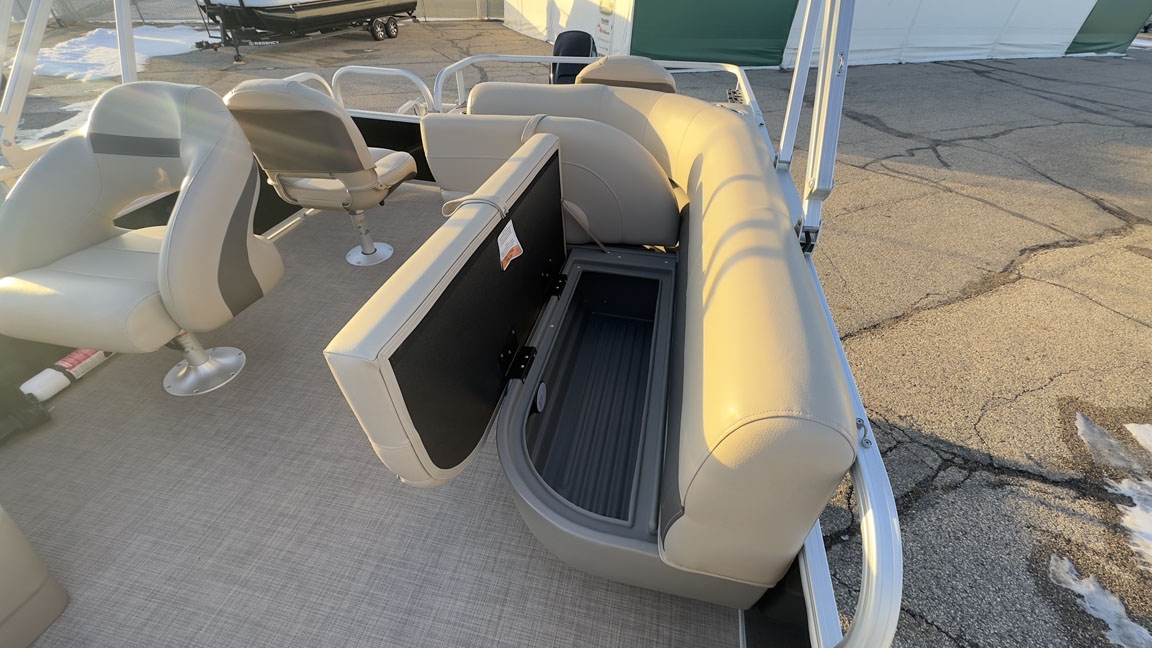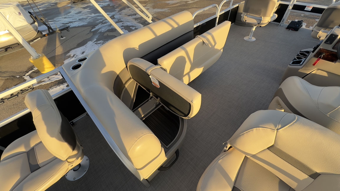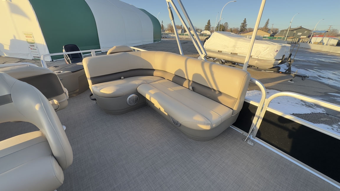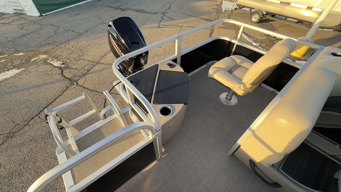 - Comfort & Convenience: It includes an aft L-lounge with underseat storage, an adjustable and swiveling helm bucket seat, and a 9' Bimini top with LED courtesy lights for shade.