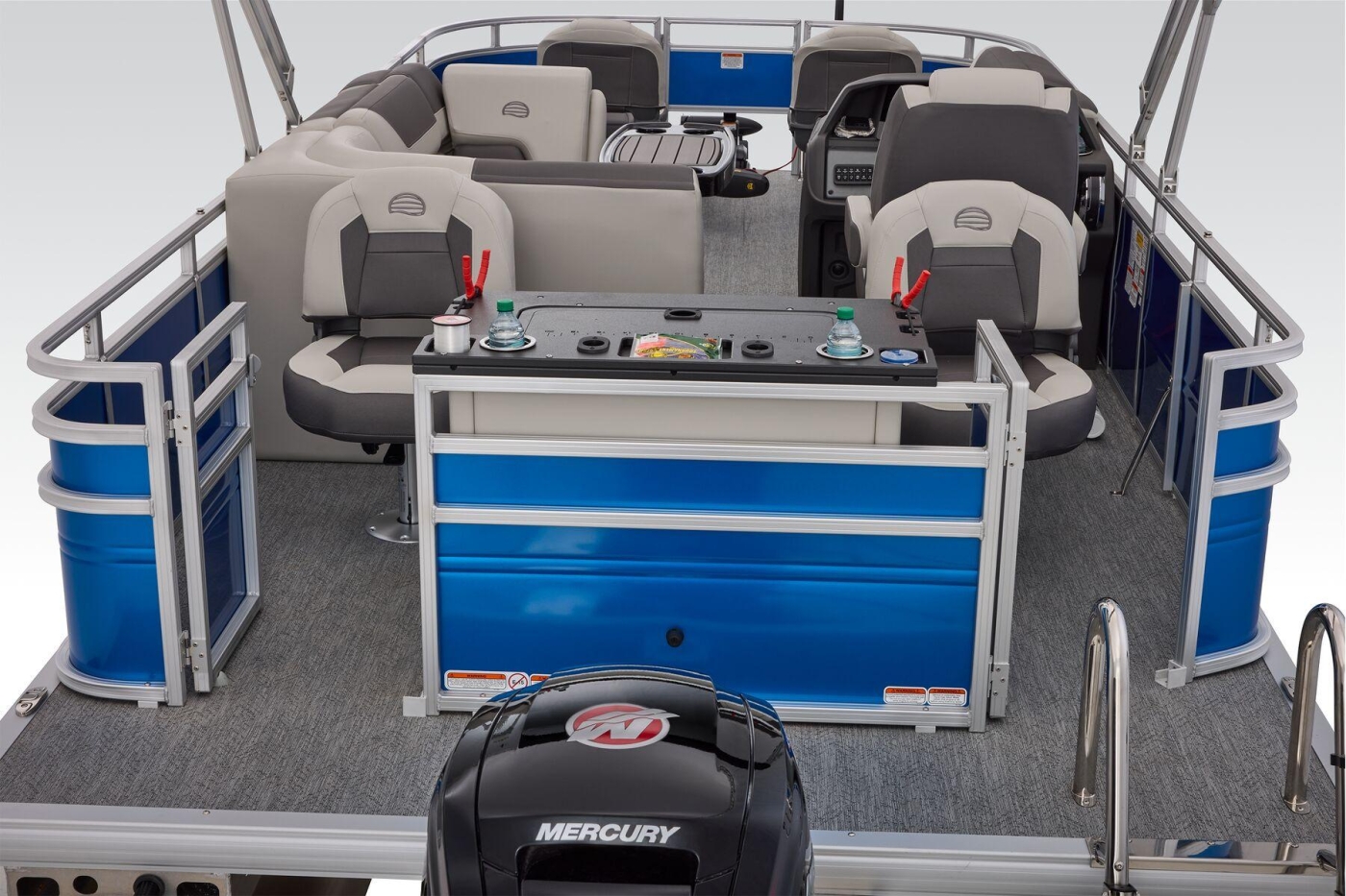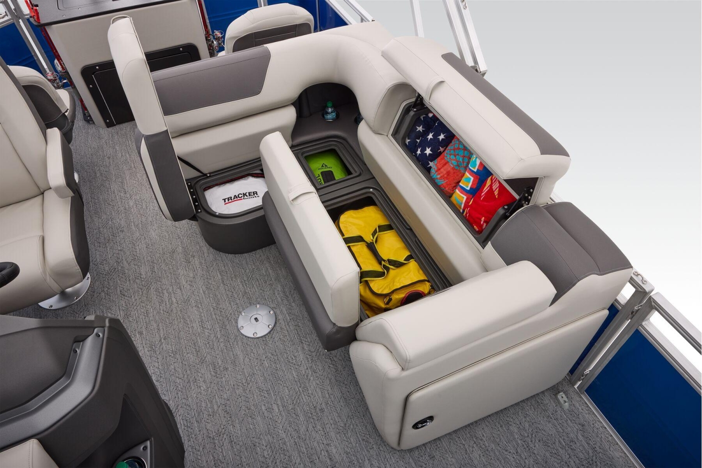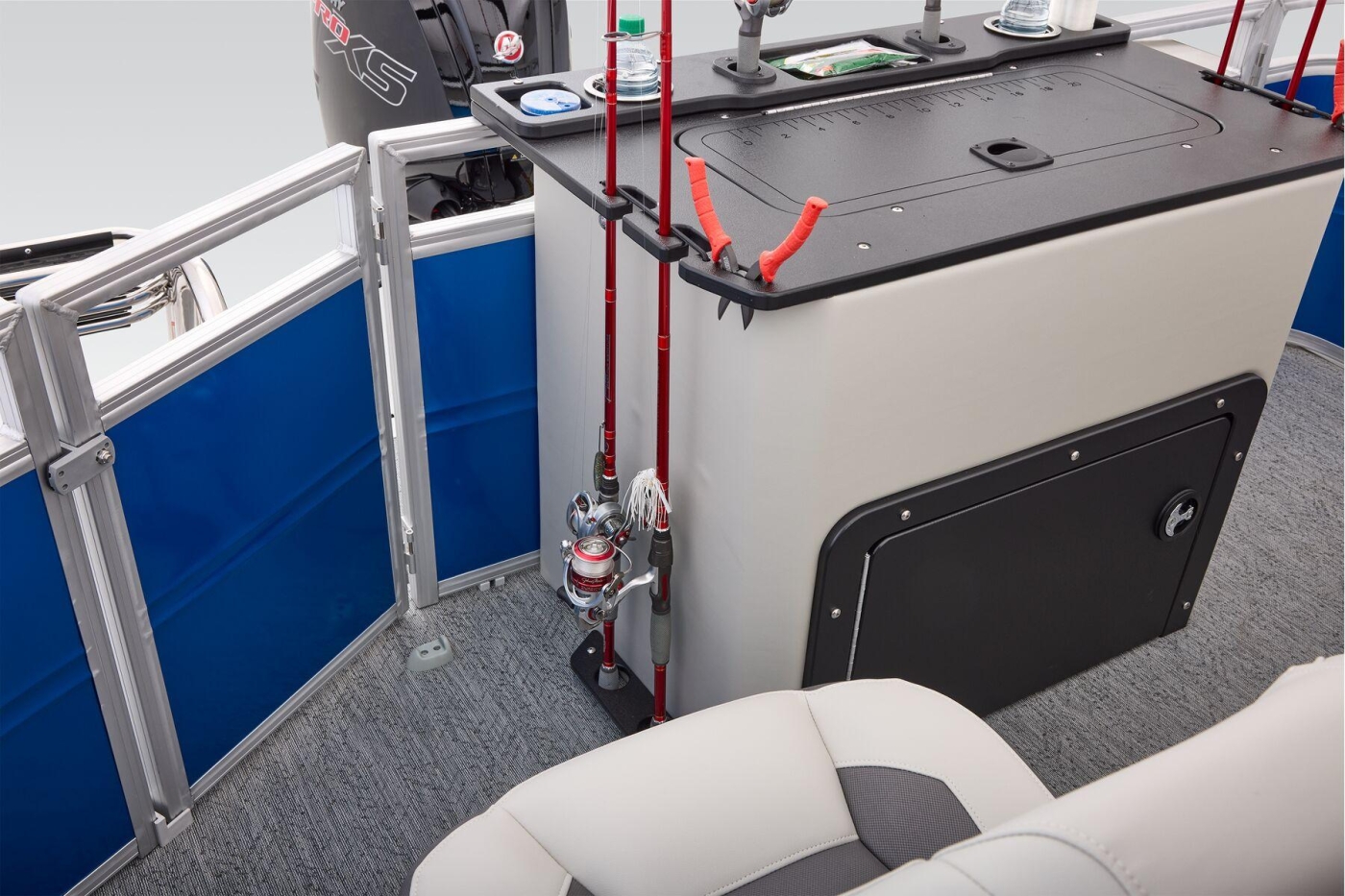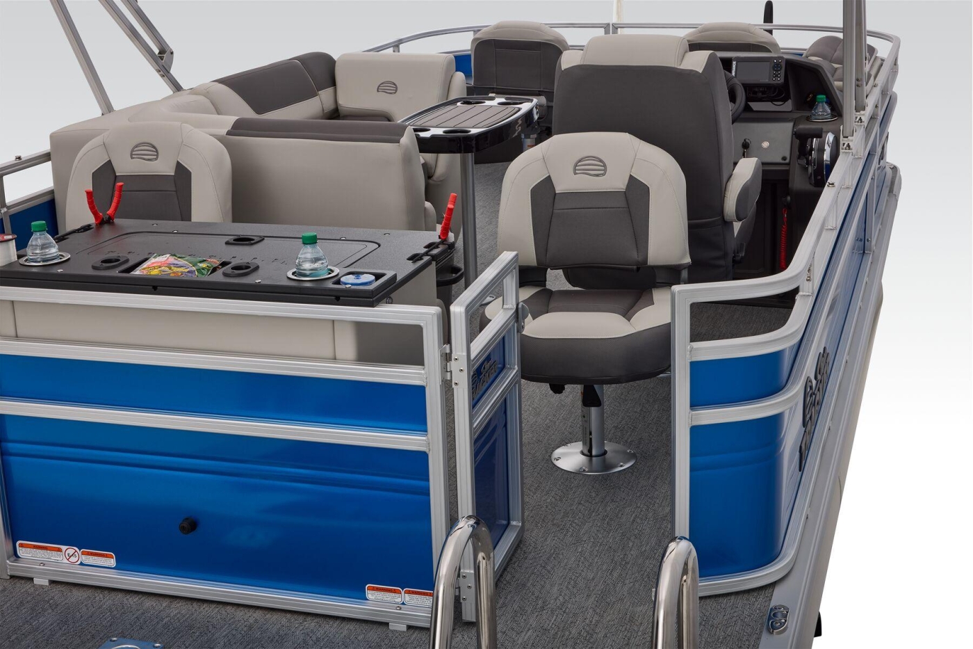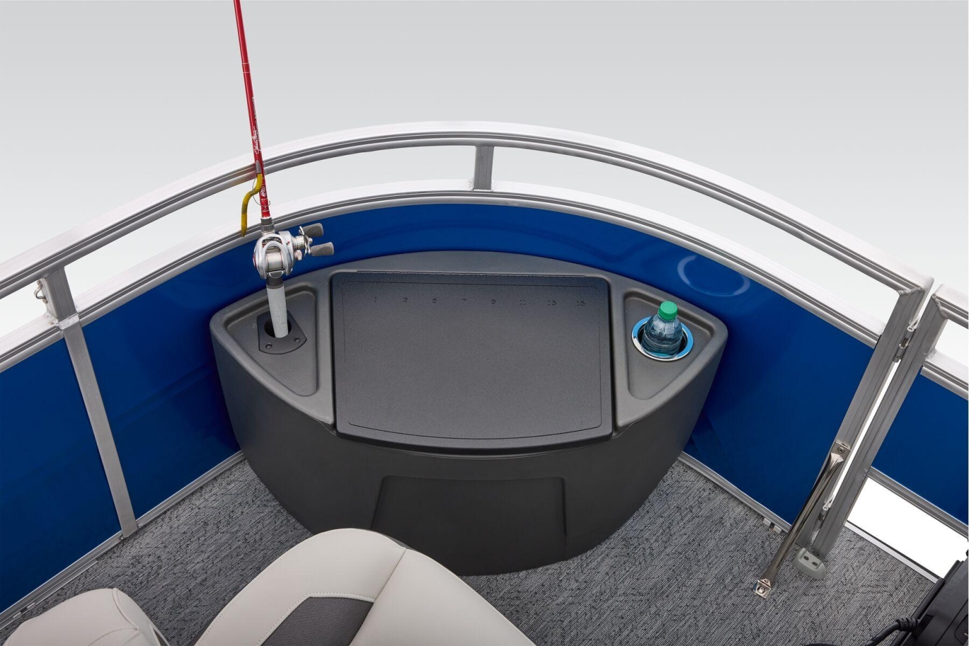 This fishing pontoon’s 19' 10" deck fits up to 10 people looking for a great day of casting lines. When it’s time for lunch, set up the removable table with drink holders near the comfortable L-shaped aft lounge. Your guests can also relax in the lounge seat in front of the driver’s console.