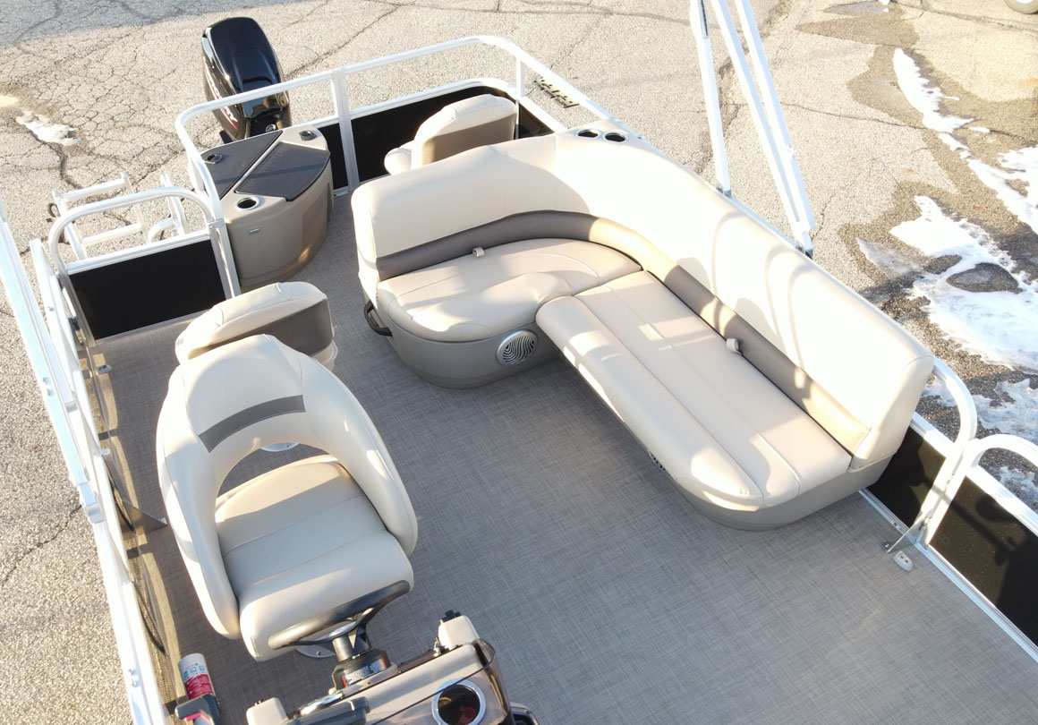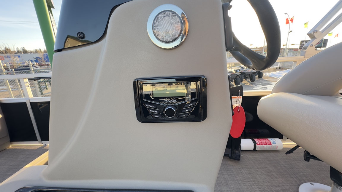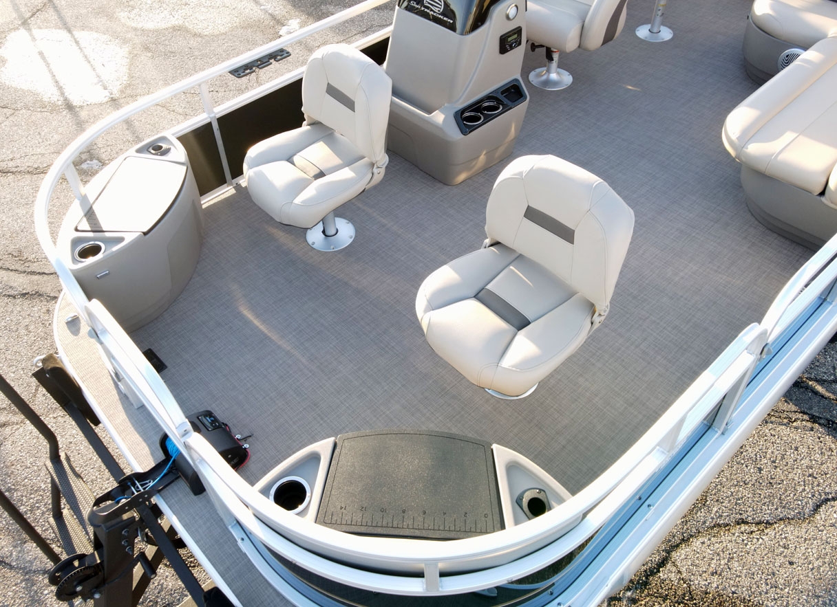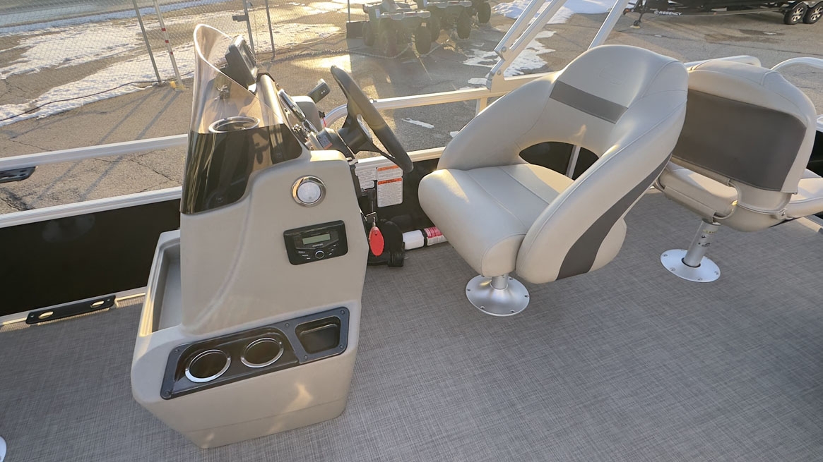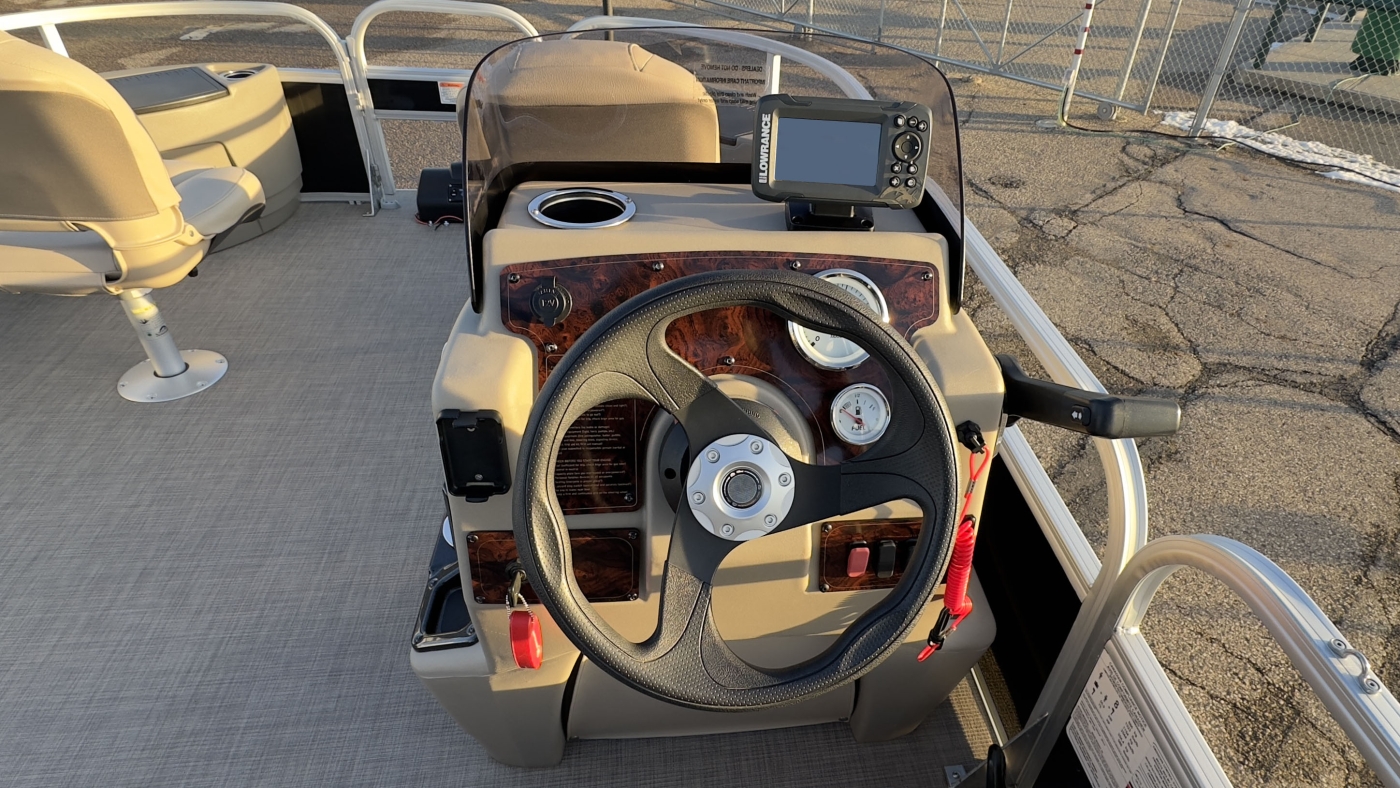 - Comfort & Convenience: It includes an aft L-lounge with underseat storage, an adjustable and swiveling helm bucket seat, and a 9' Bimini top with LED courtesy lights for shade.