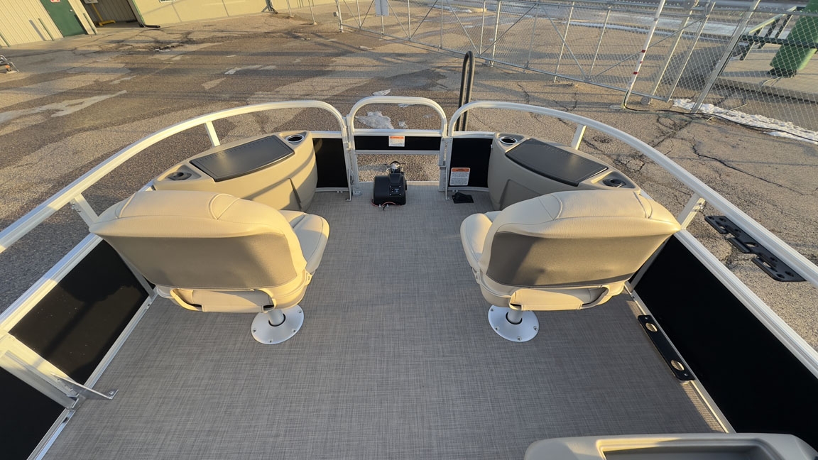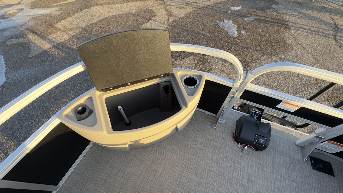 - Fishing Amenities: The boat features a bow fishing deck with two removable folding fishing chairs, a forward-console 9-gallon aerated livewell, an aft 8-gallon aerated livewell/baitwell, and rail-mounted rod and tool holders.