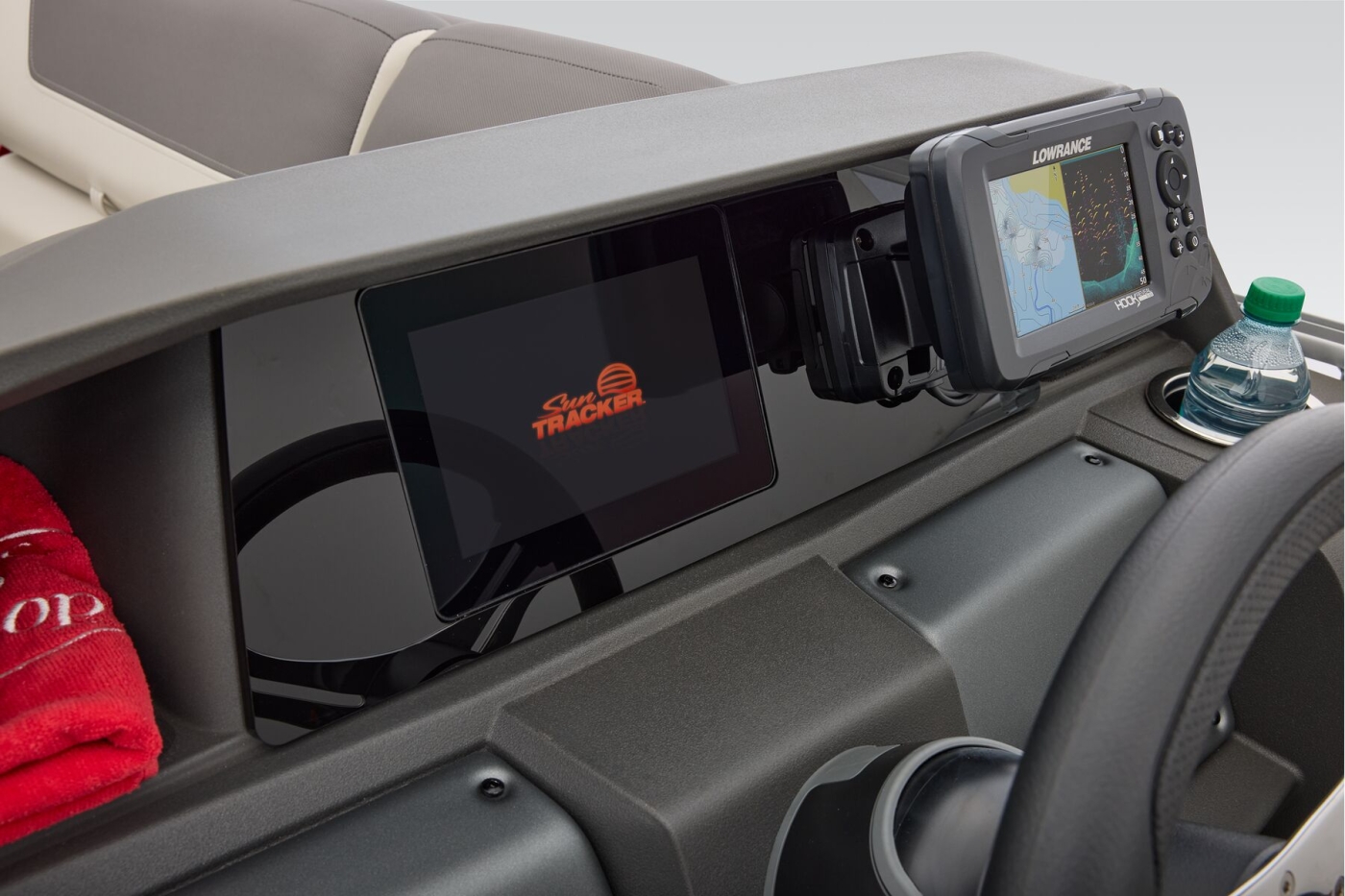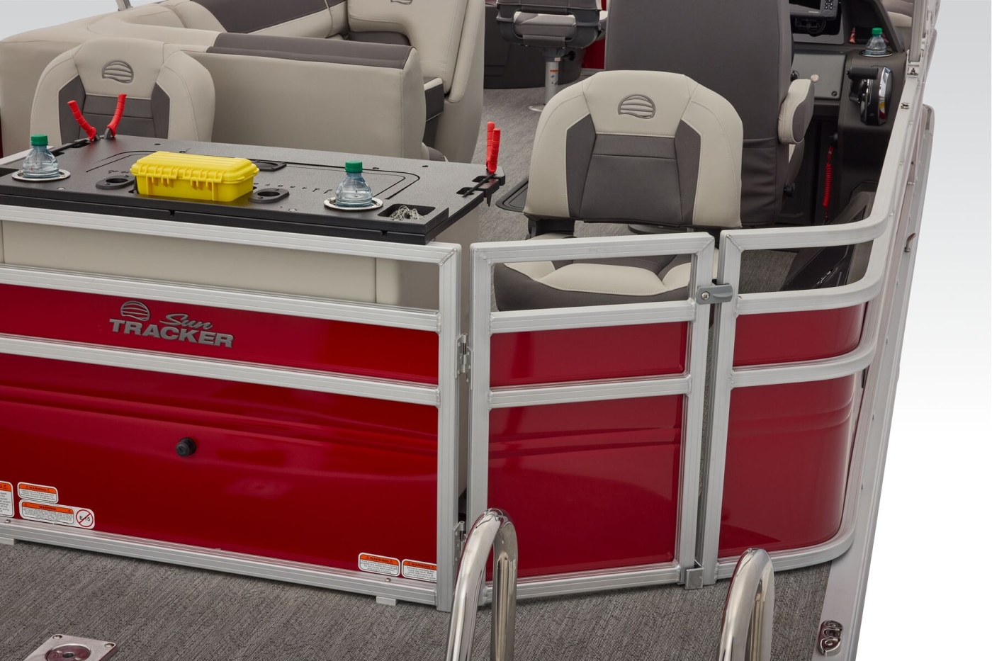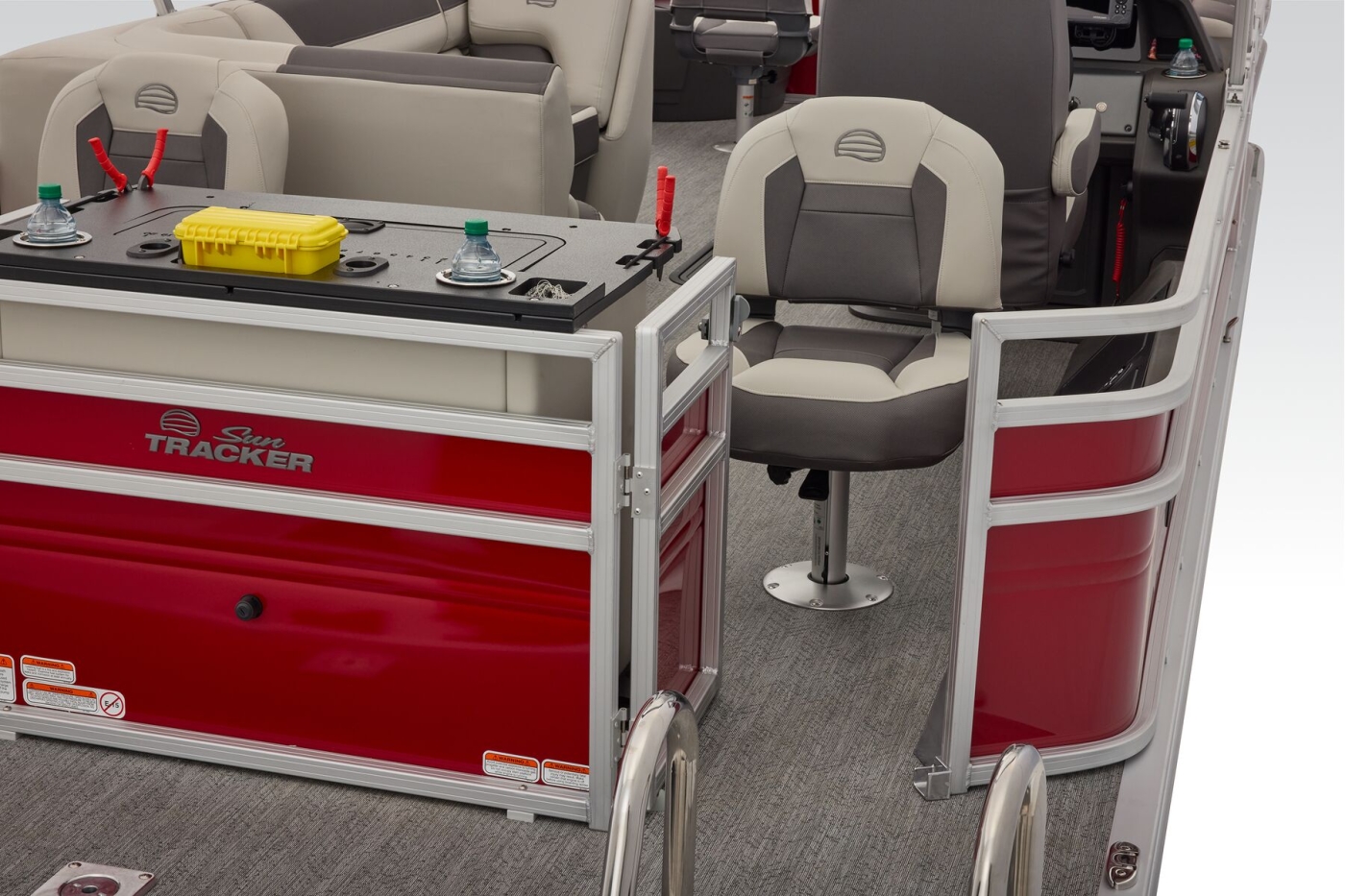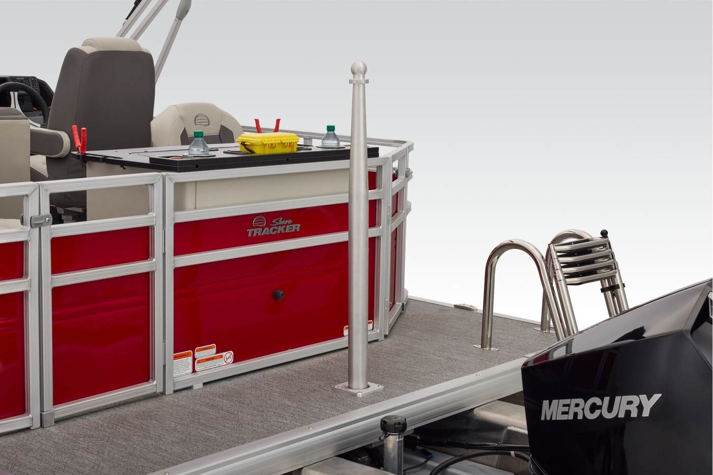 Captains can control it all with the SUN TRACKER FLARE™ touch-screen gauge display. Set up the 10' bimini top, grab your rod out of the lockable rod box, and post up in one of the two fishing decks—each of which sports a 16-gal. aerated livewell—and two swiveling fishing chairs next to rod and tool holders. The dual lounges or aft bench with hidden storage are ready for relaxation. The lounges’ all-new open section in the backrest increases accessible storage and even has extra cupholders. 2026 also brings a wider, ergonomic boarding ladder.