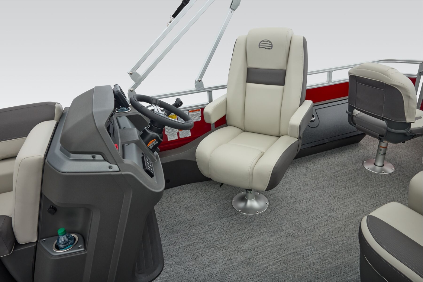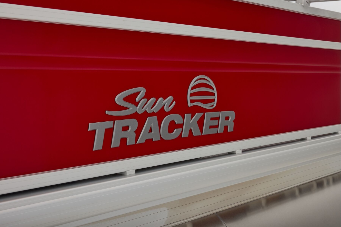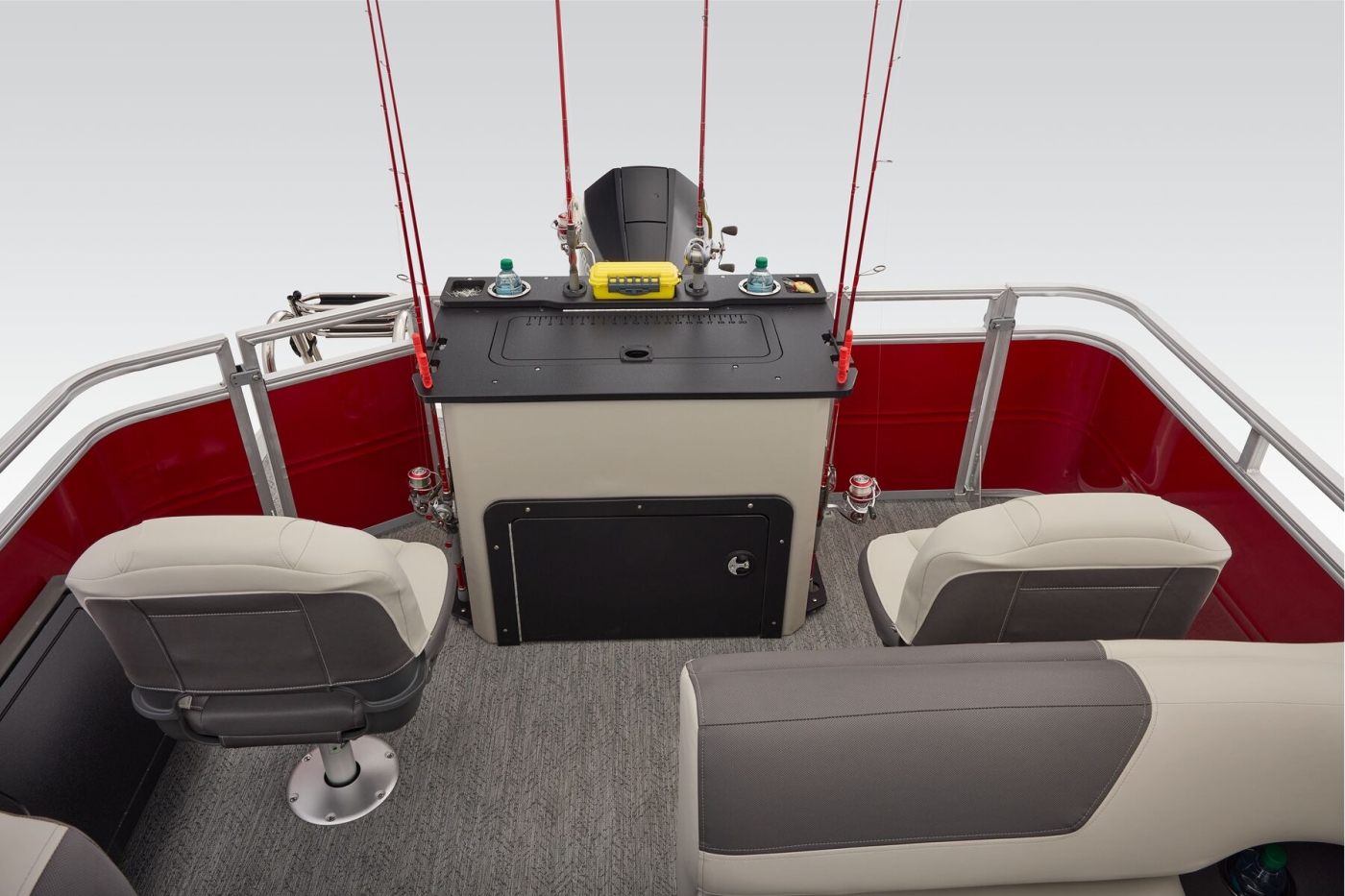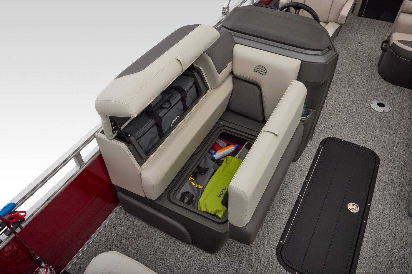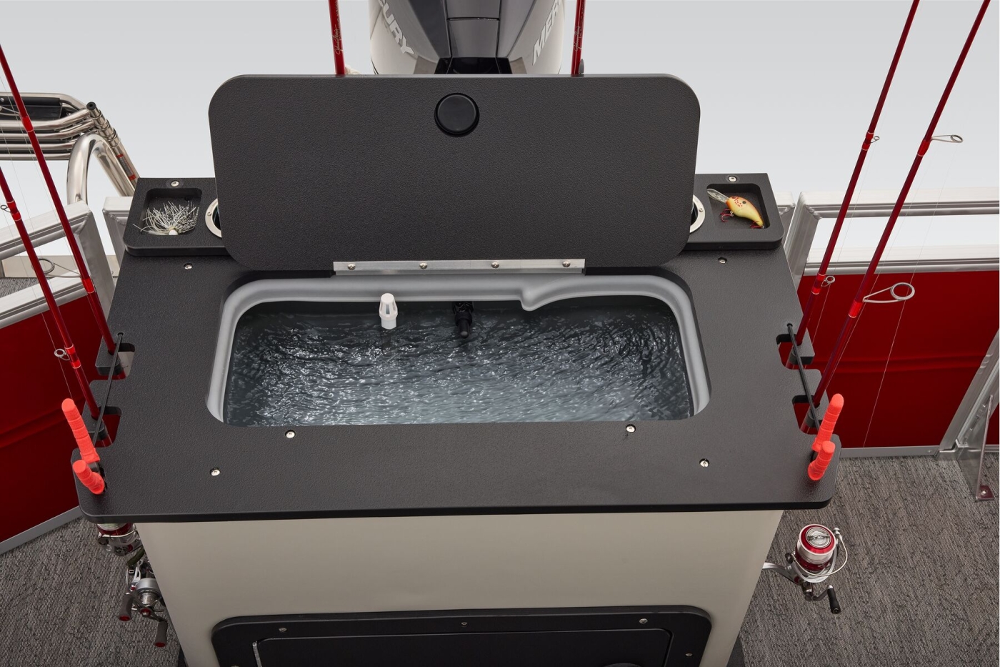 Captains can control it all with the SUN TRACKER FLARE™ touch-screen gauge display. Set up the 10' bimini top, grab your rod out of the lockable rod box, and post up in one of the two fishing decks—each of which sports a 16-gal. aerated livewell—and two swiveling fishing chairs next to rod and tool holders. The dual lounges or aft bench with hidden storage are ready for relaxation. The lounges’ all-new open section in the backrest increases accessible storage and even has extra cupholders. 2026 also brings a wider, ergonomic boarding ladder.