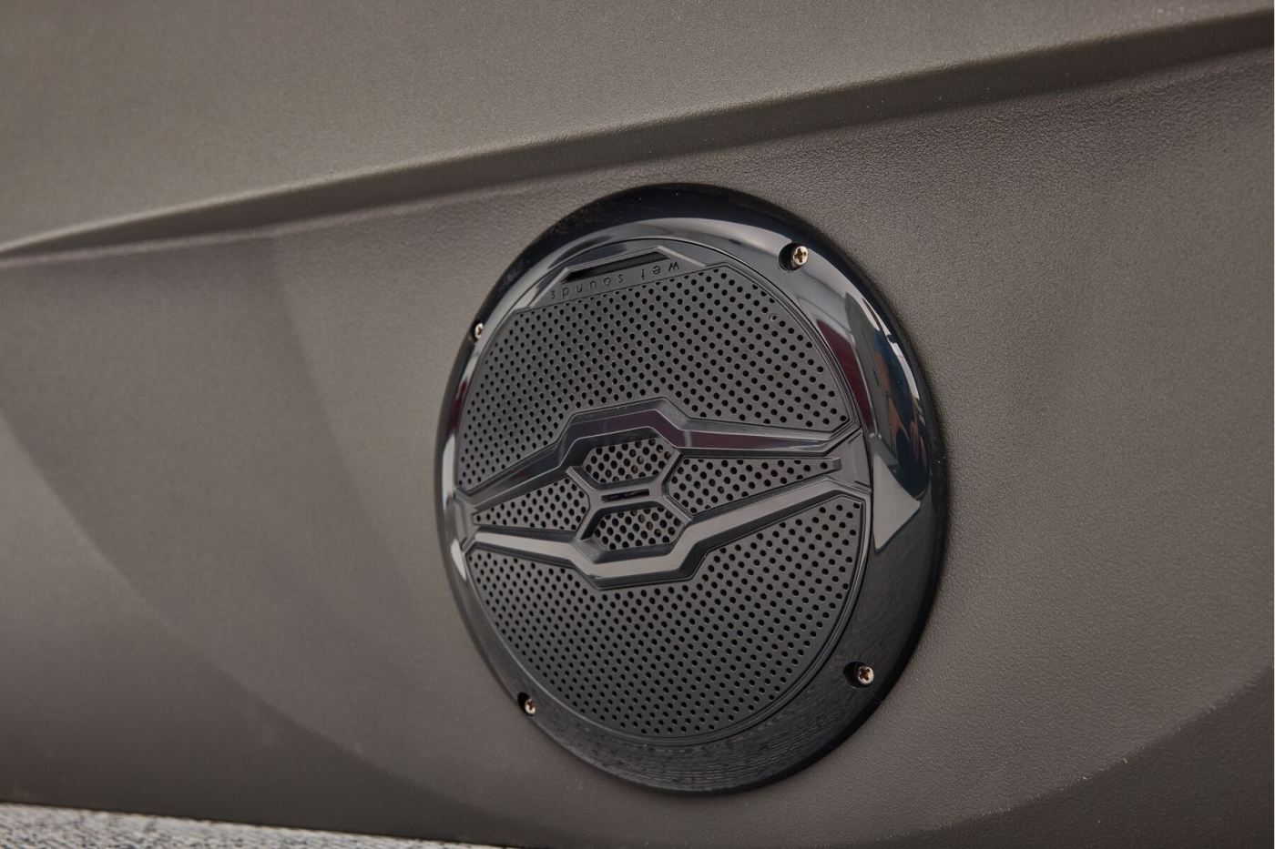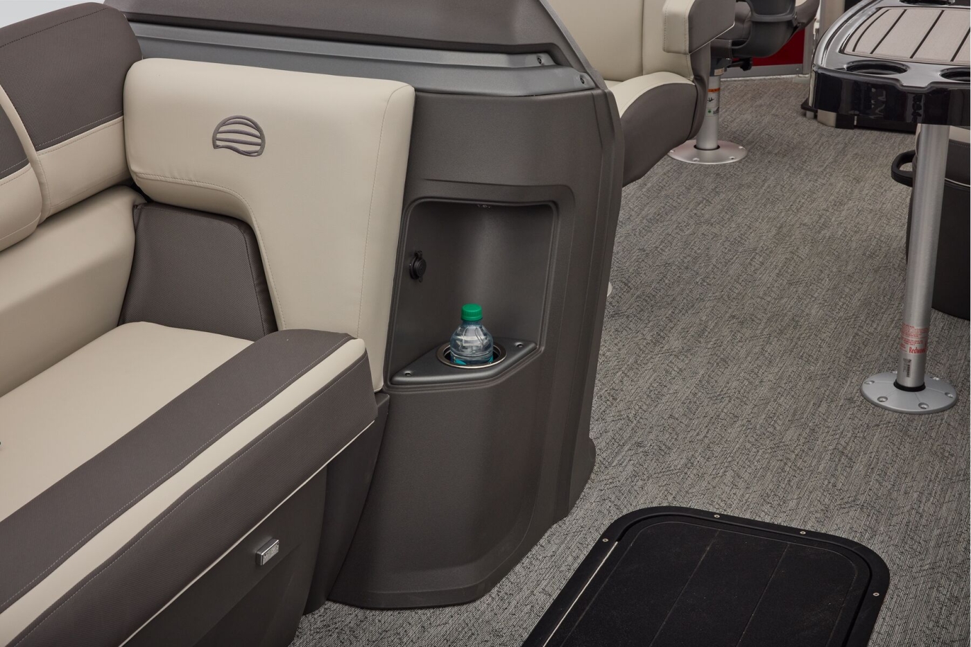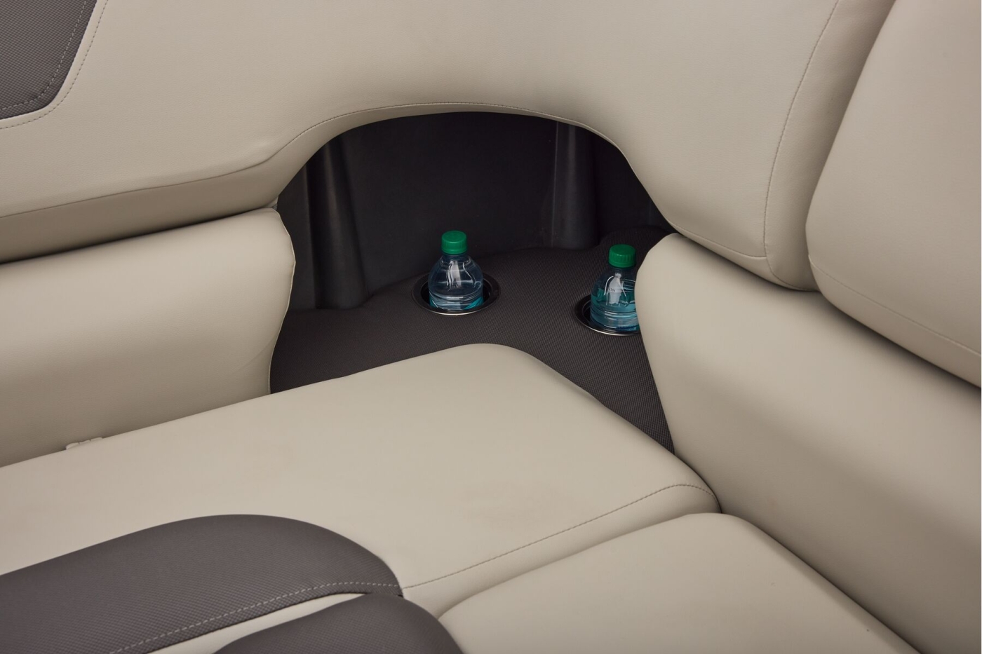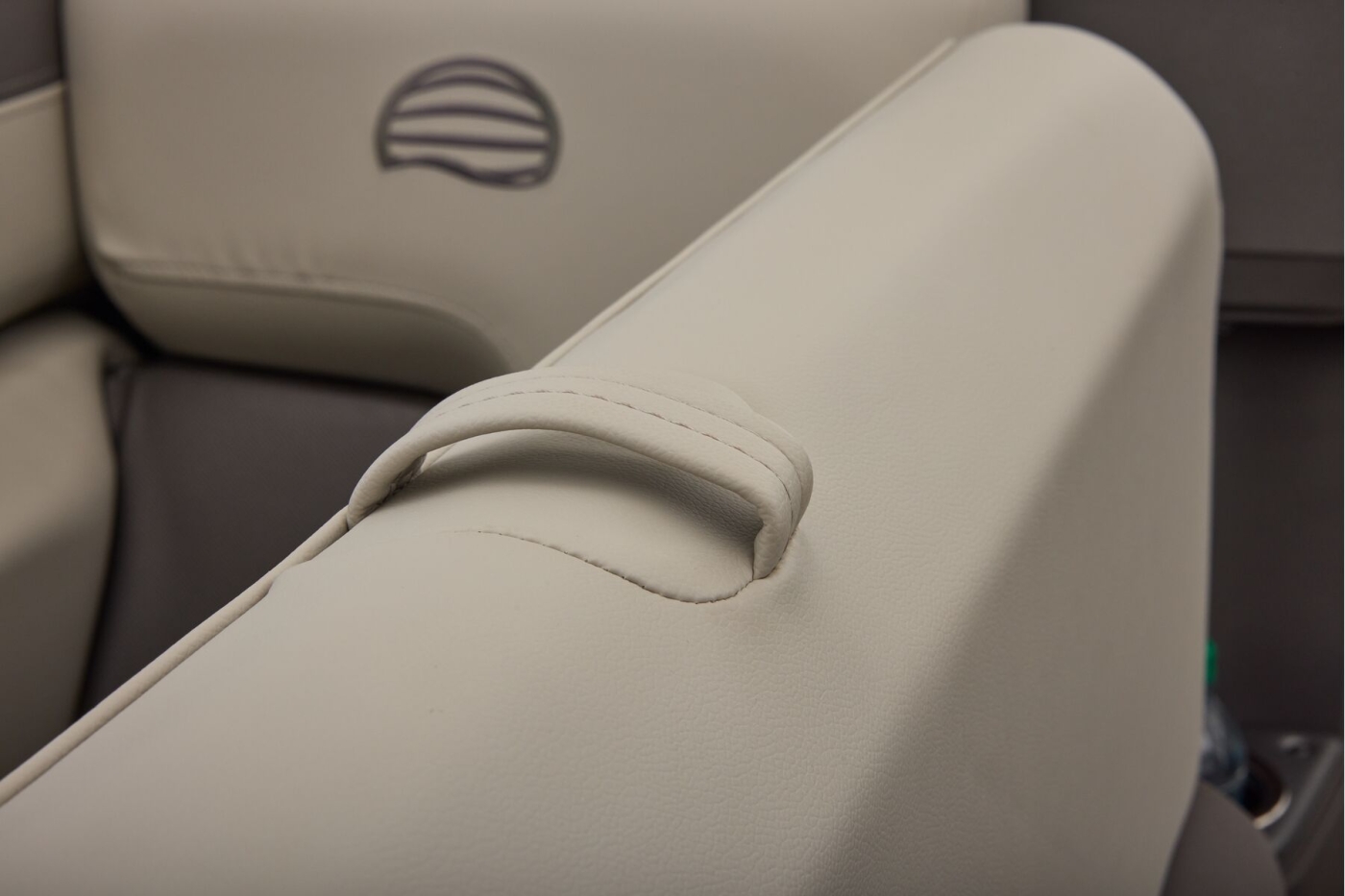Captains can control it all with the SUN TRACKER FLARE™ touch-screen gauge display. Set up the 10' bimini top, grab your rod out of the lockable rod box, and post up in one of the two fishing decks—each of which sports a 16-gal. aerated livewell—and two swiveling fishing chairs next to rod and tool holders. The dual lounges or aft bench with hidden storage are ready for relaxation. The lounges’ all-new open section in the backrest increases accessible storage and even has extra cupholders. 2026 also brings a wider, ergonomic boarding ladder.