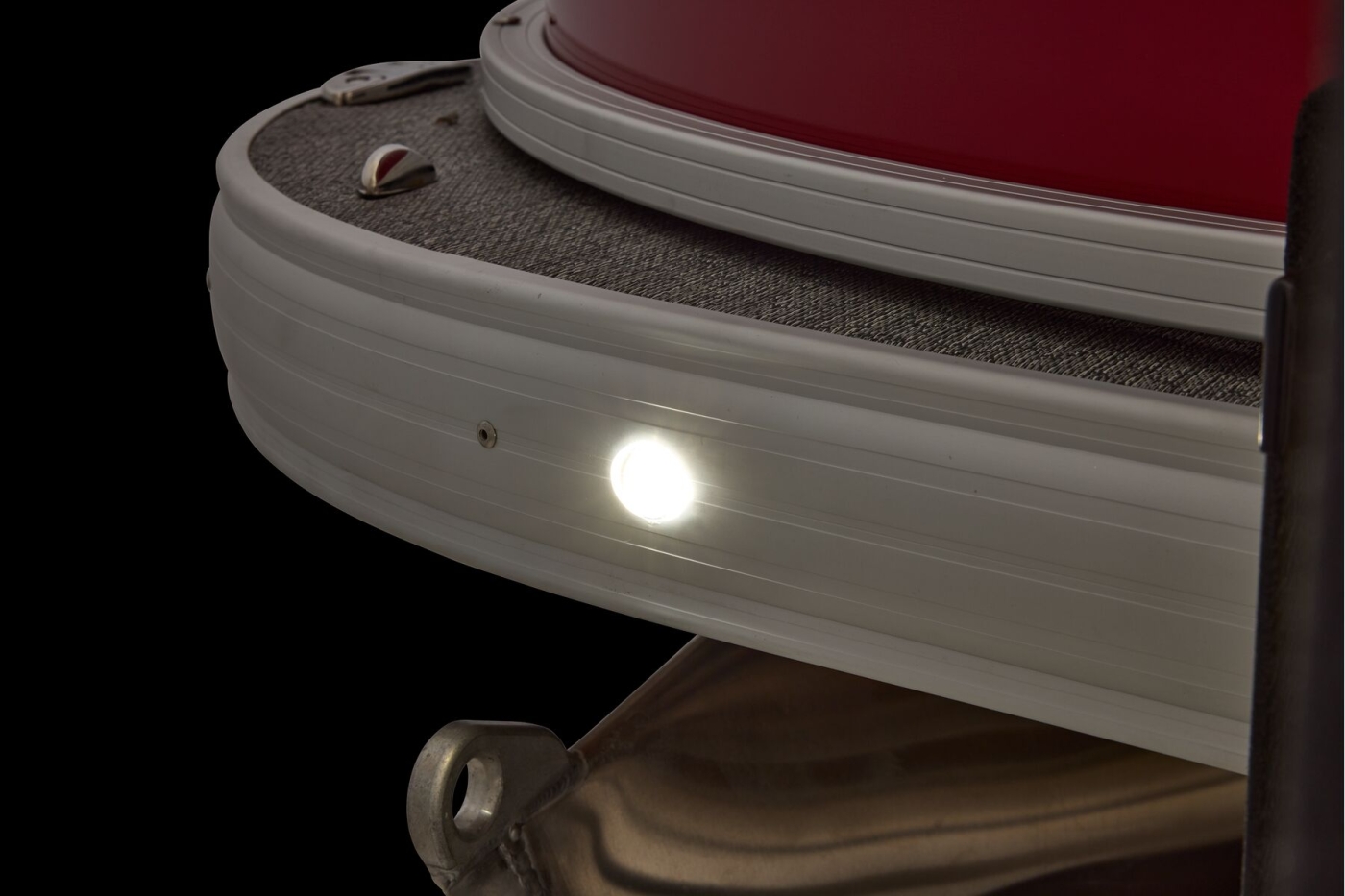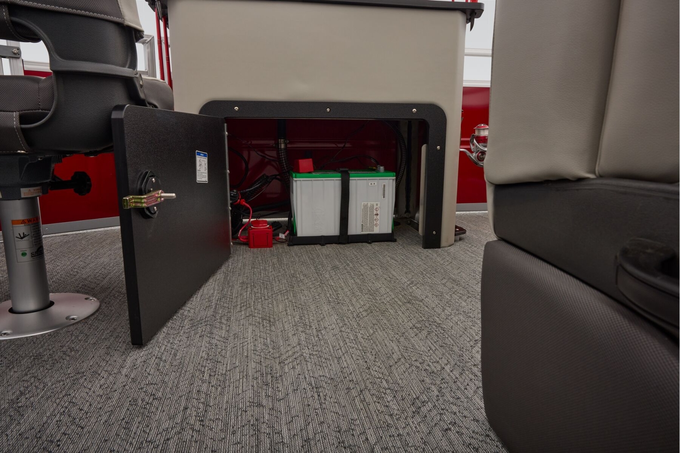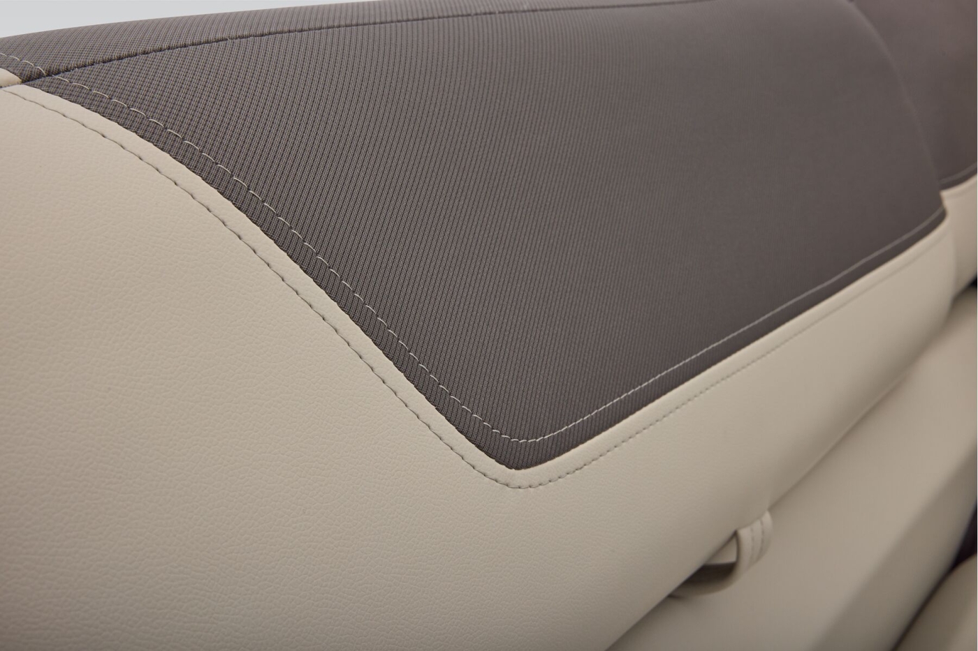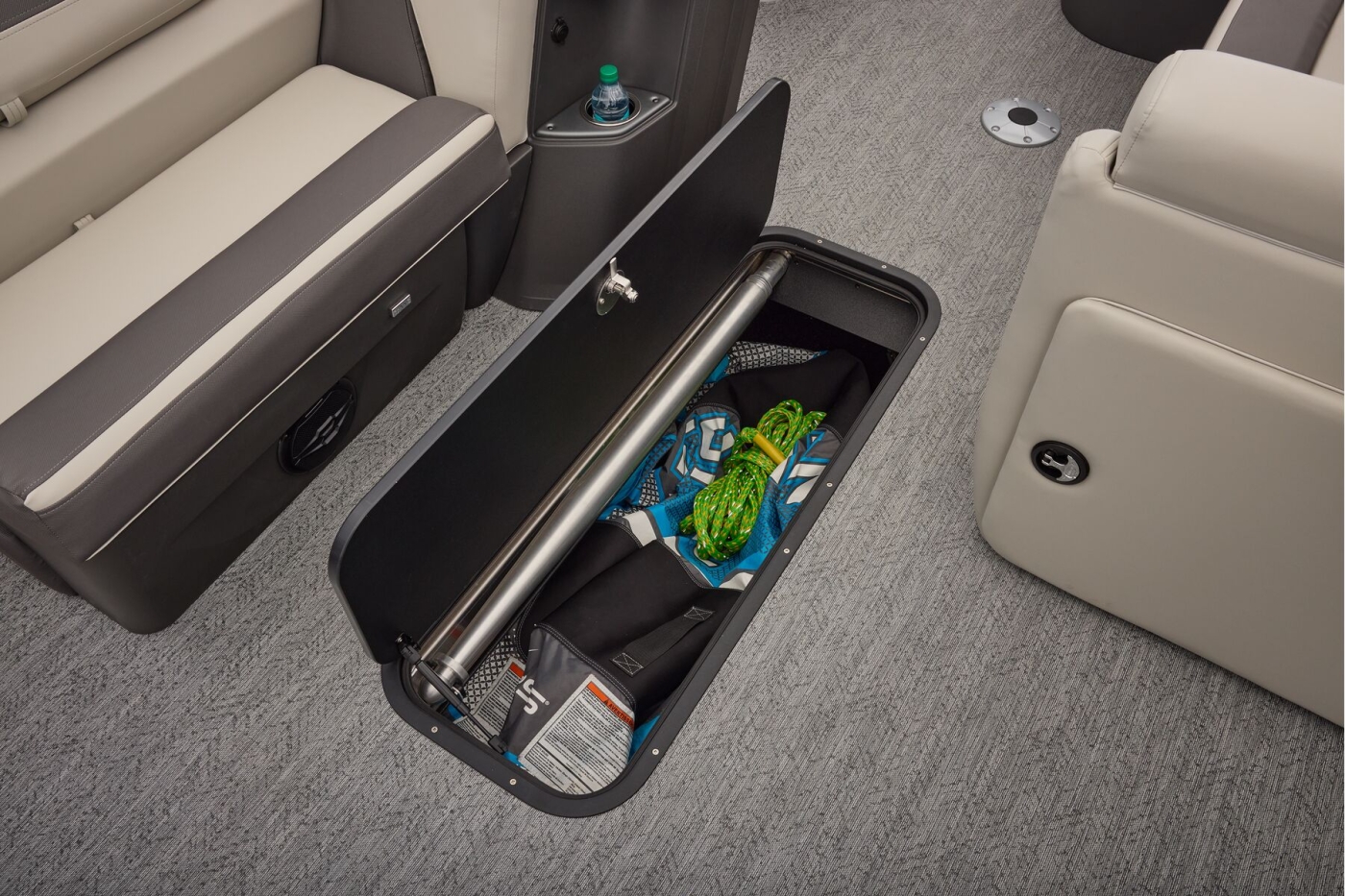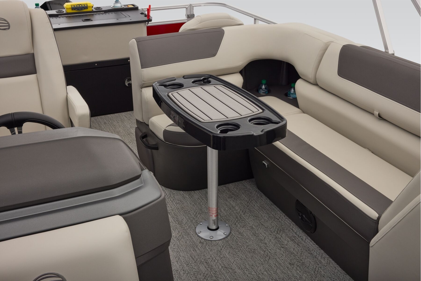 Captains can control it all with the SUN TRACKER FLARE™ touch-screen gauge display. Set up the 10' bimini top, grab your rod out of the lockable rod box, and post up in one of the two fishing decks—each of which sports a 16-gal. aerated livewell—and two swiveling fishing chairs next to rod and tool holders. The dual lounges or aft bench with hidden storage are ready for relaxation. The lounges’ all-new open section in the backrest increases accessible storage and even has extra cupholders. 2026 also brings a wider, ergonomic boarding ladder.